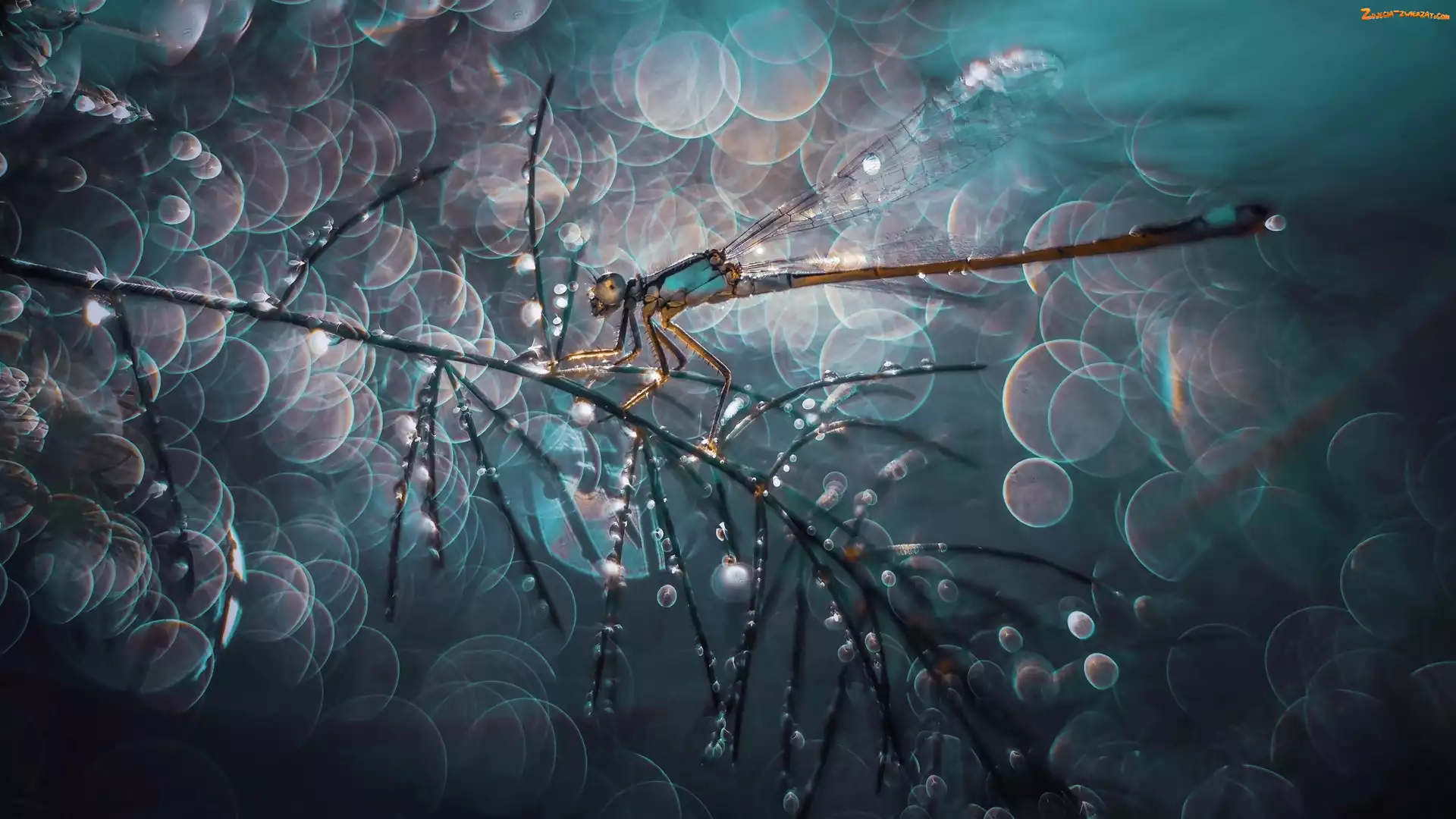 Zdjęcie: Ważka, Gałązka, Bokeh, Krople