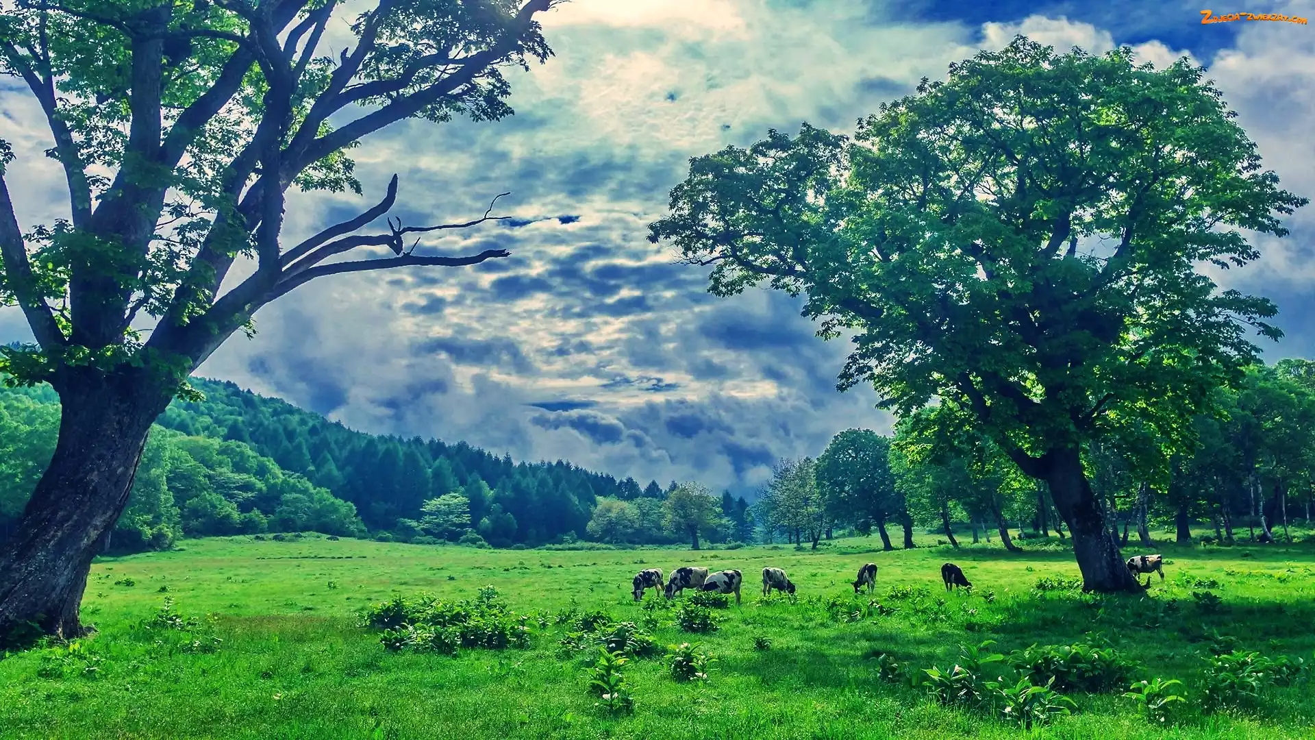 Zdjęcie: Krowy, Chmury, Pastwisko, Łąka, Drzewa