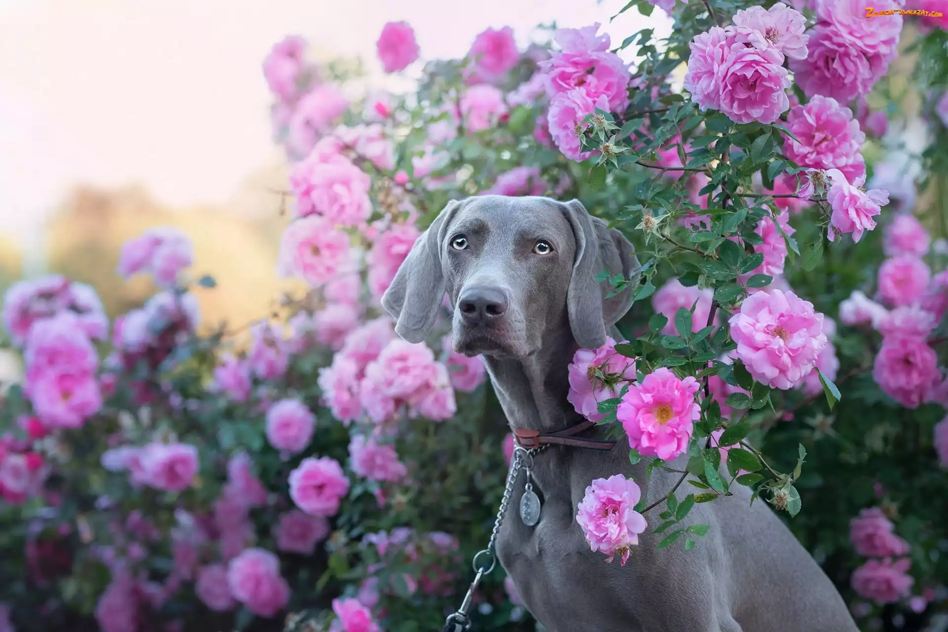 Zdjęcie: Krzew, Róże, Wyżeł weimarski, Pies, Kwiaty