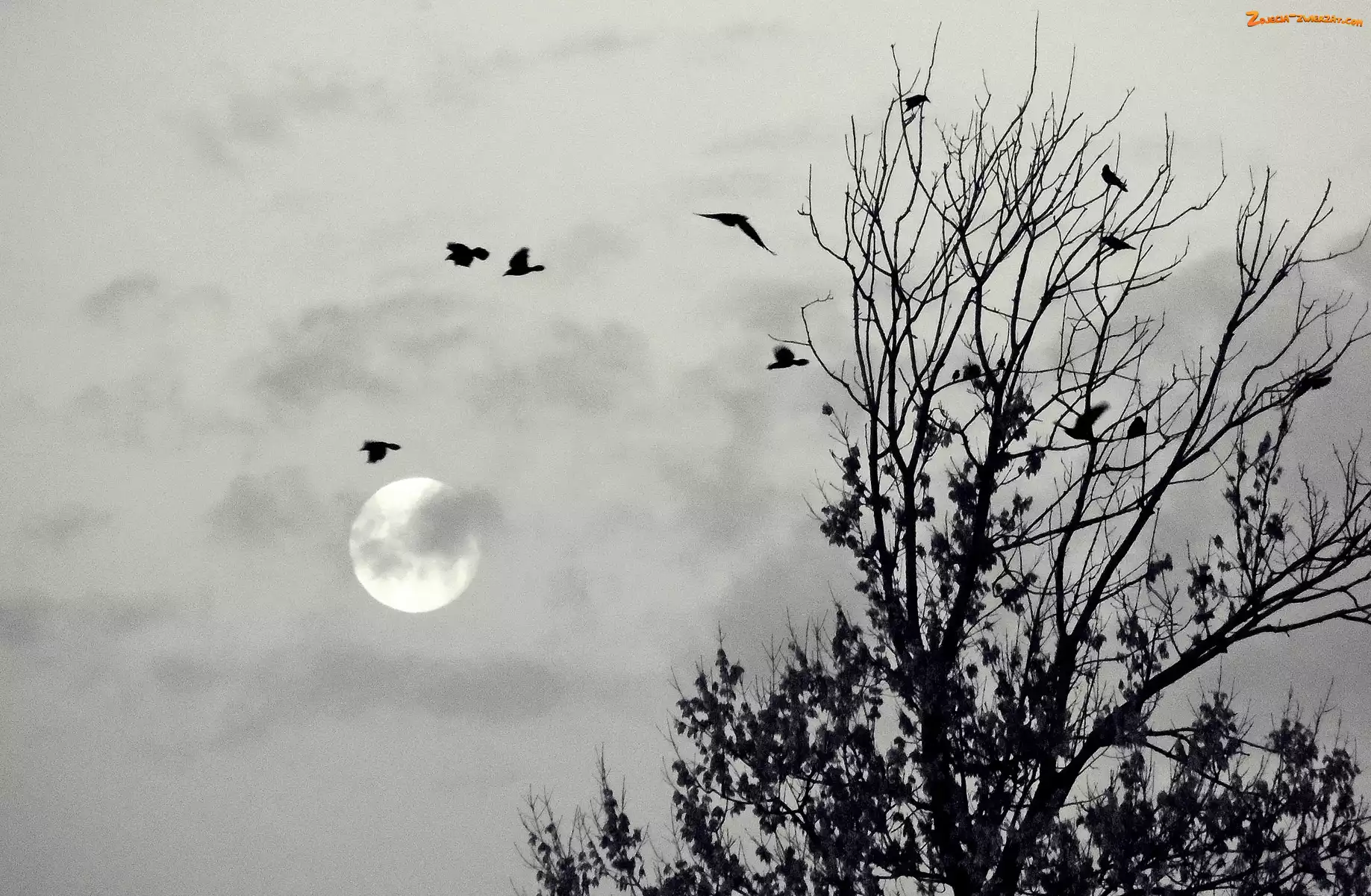 Zdjęcie: Ptaki, Księżyc, Drzewa