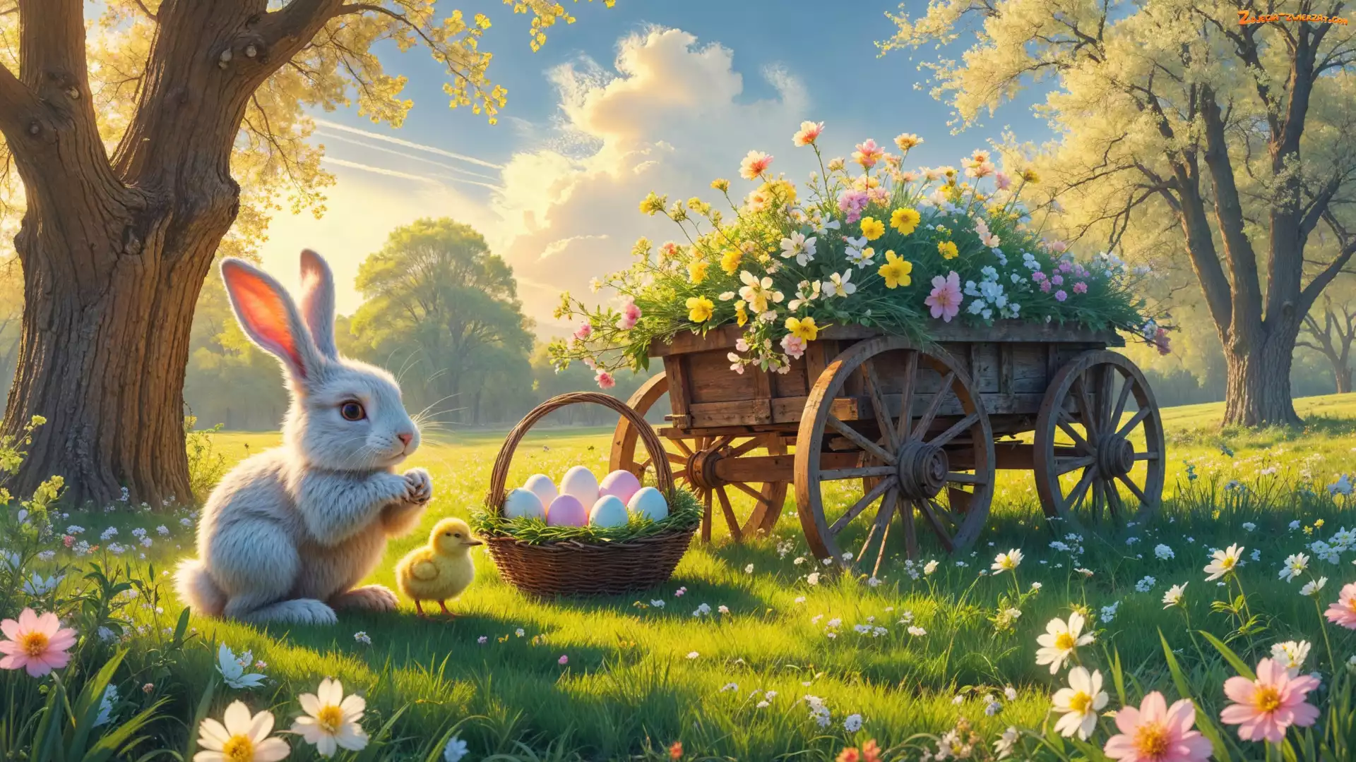 Zdjęcie: Wóz, Koszyk, Kwiaty, Wielkanoc, Łąka, Królik, Pisanki, Kurczak