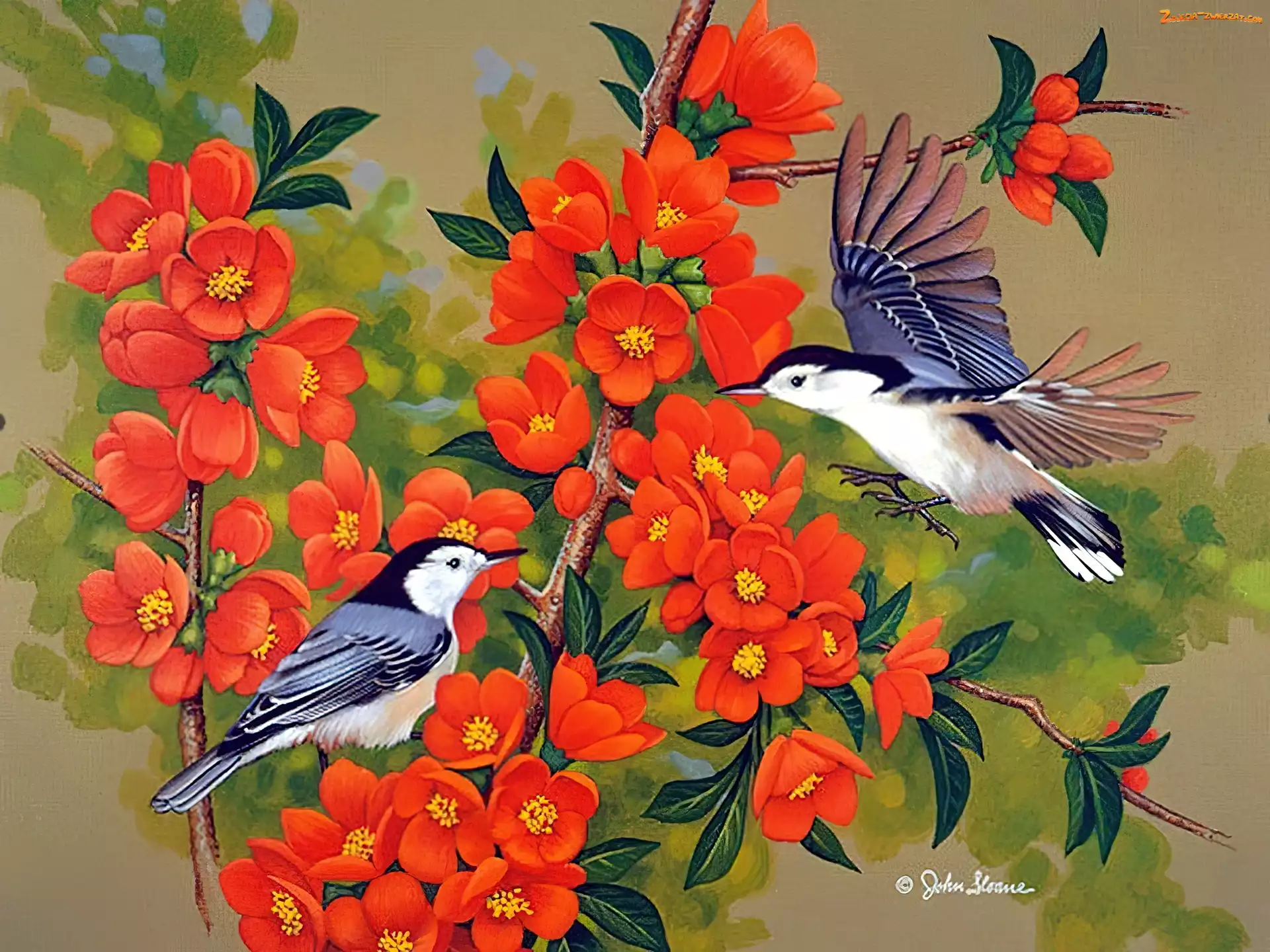 Zdjęcie: Czerwone, Kwiatki, Ptaki, Dwa