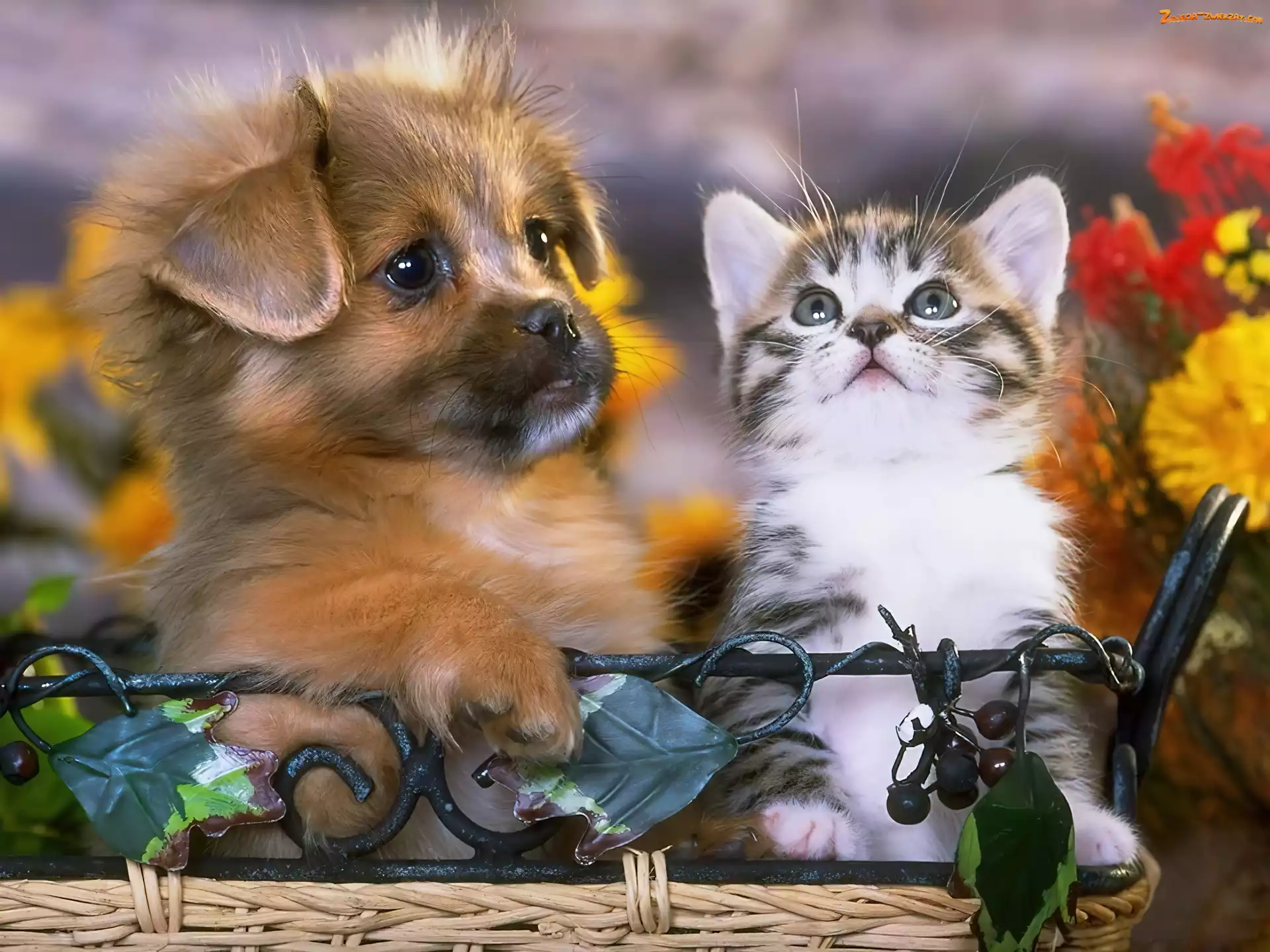 Zdjęcie: Koszyk, Szczeniak, Kwiatki, Kotek, Piesek