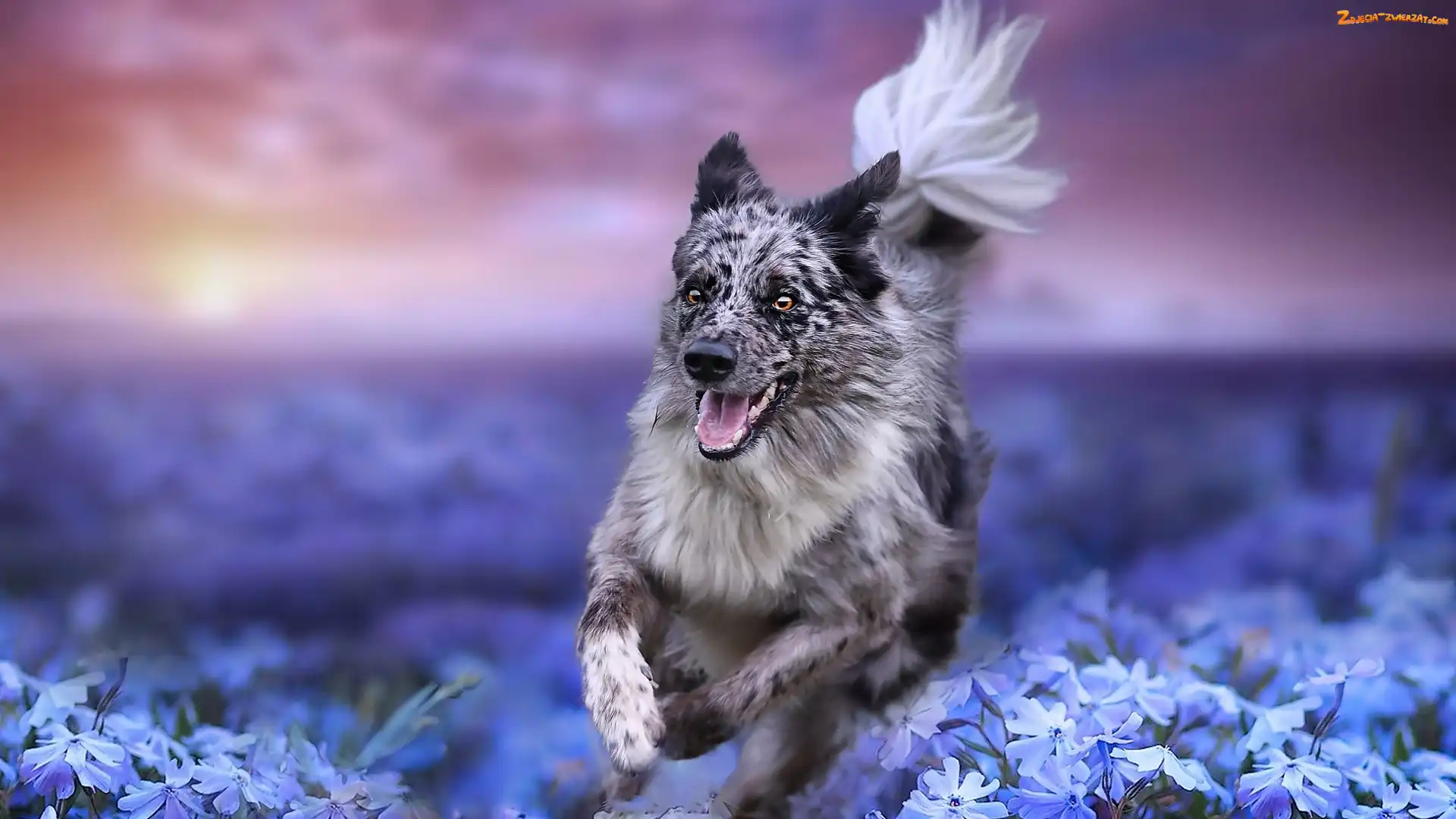 Zdjęcie: Kwiaty, Łąka, Pies, Biegnący, Border collie