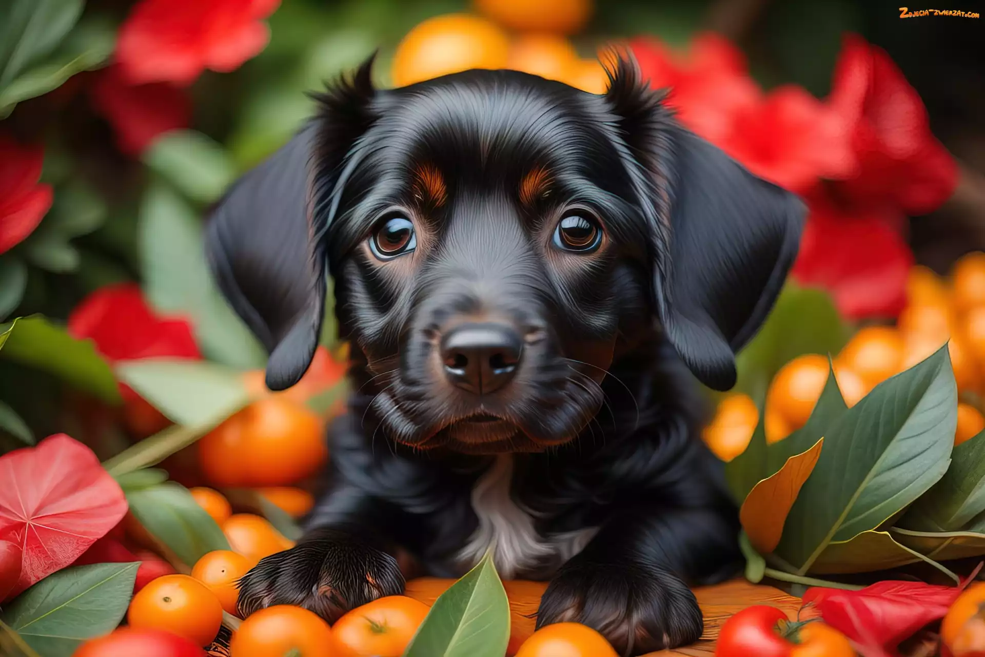 Zdjęcie: Czarny, Pies, Listki, Kwiaty