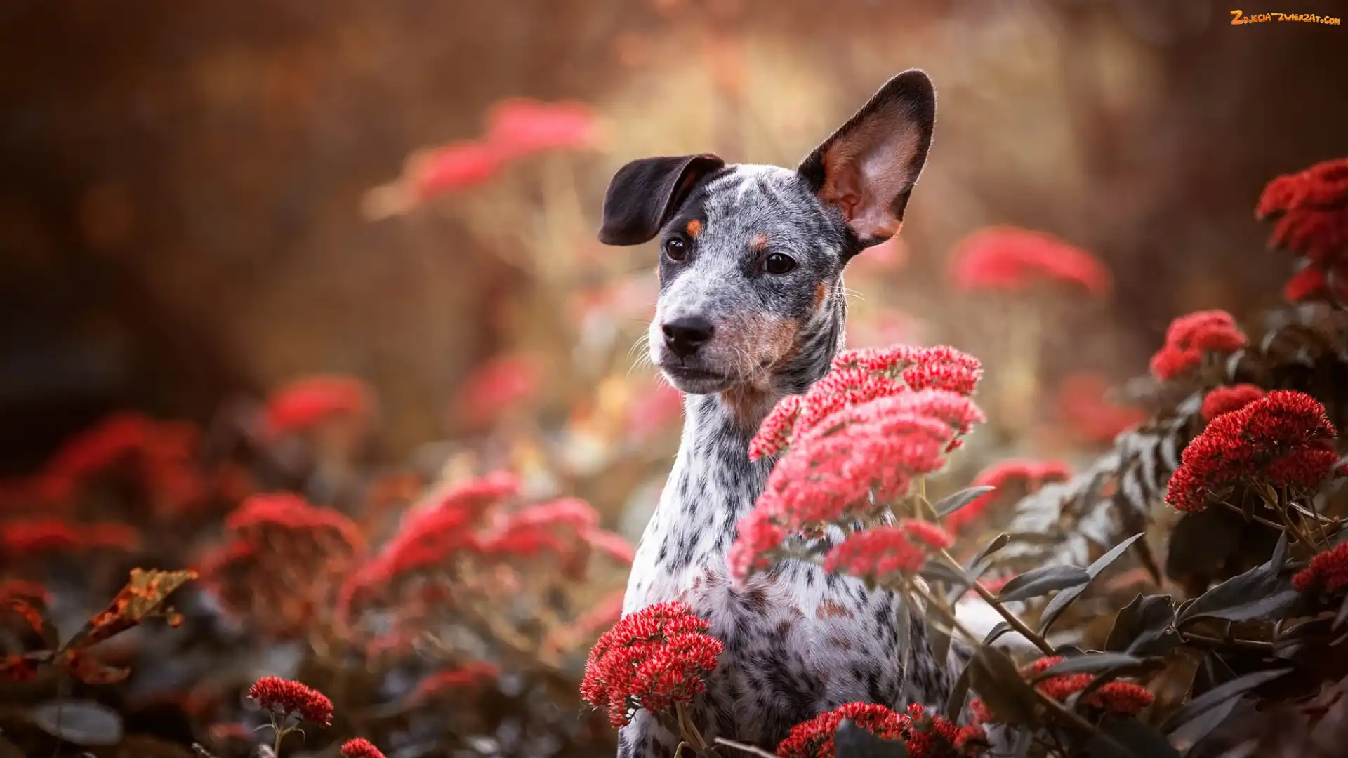 Zdjęcie: Kwiaty, Szczeniak, Czerwone, Pies