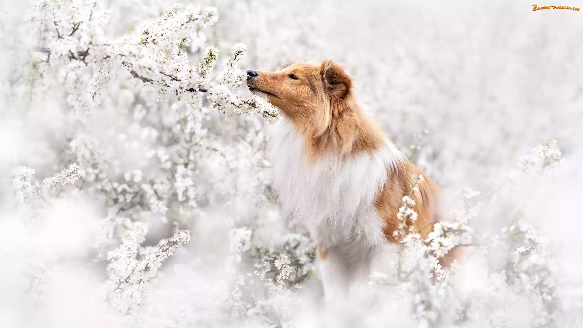 Zdjęcie: Drzewo owocowe, Gałązki, Kwiaty, Pies, Owczarek szetlandzki