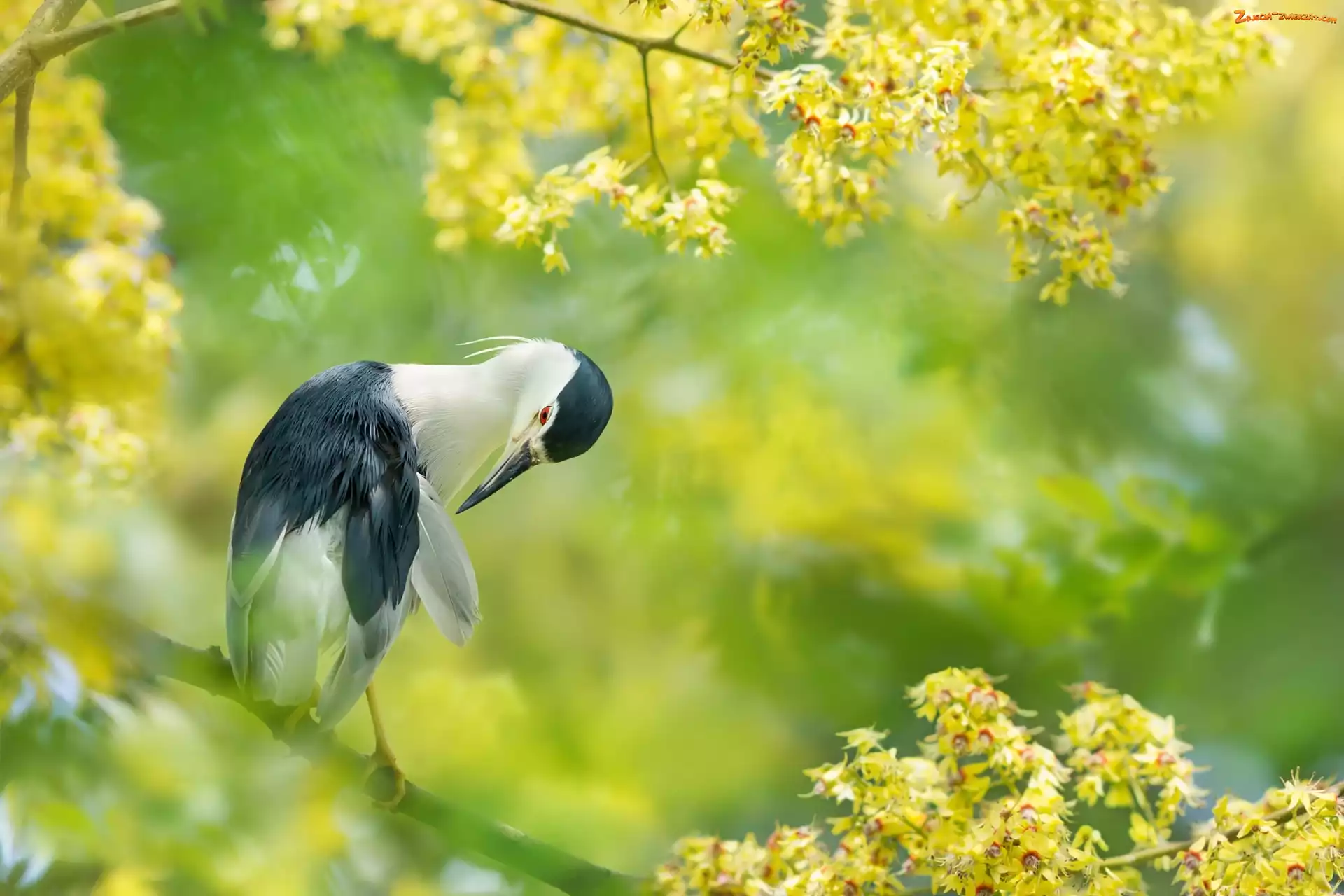 Zdjęcie: Kwiaty, Ślepowron zwyczajny, Gałęzie, Ptak