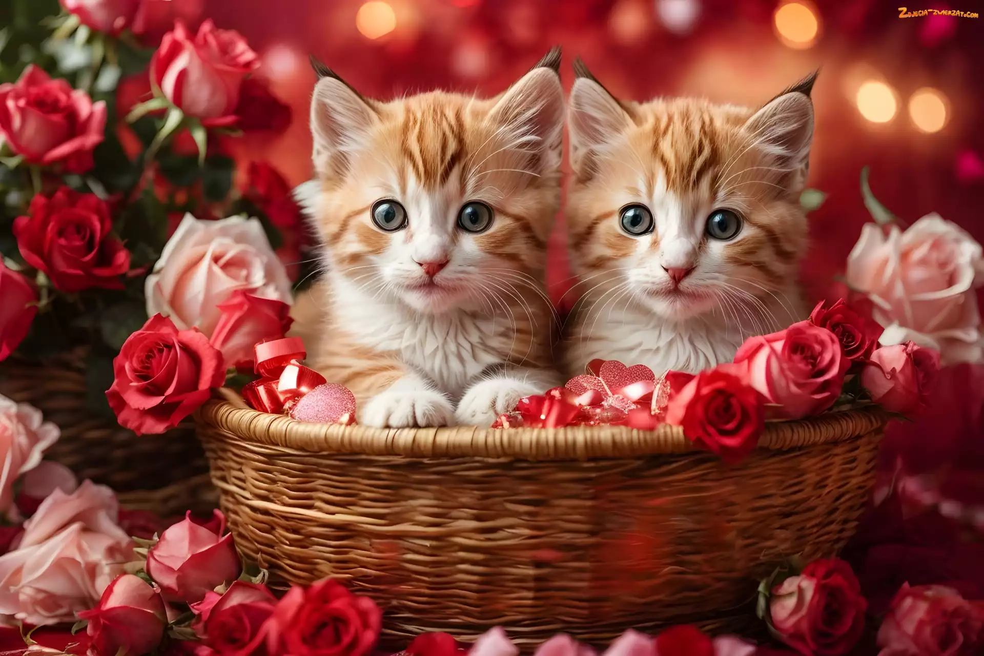 Zdjęcie: Róże, Kwiaty, Grafika, Koty, Koszyk