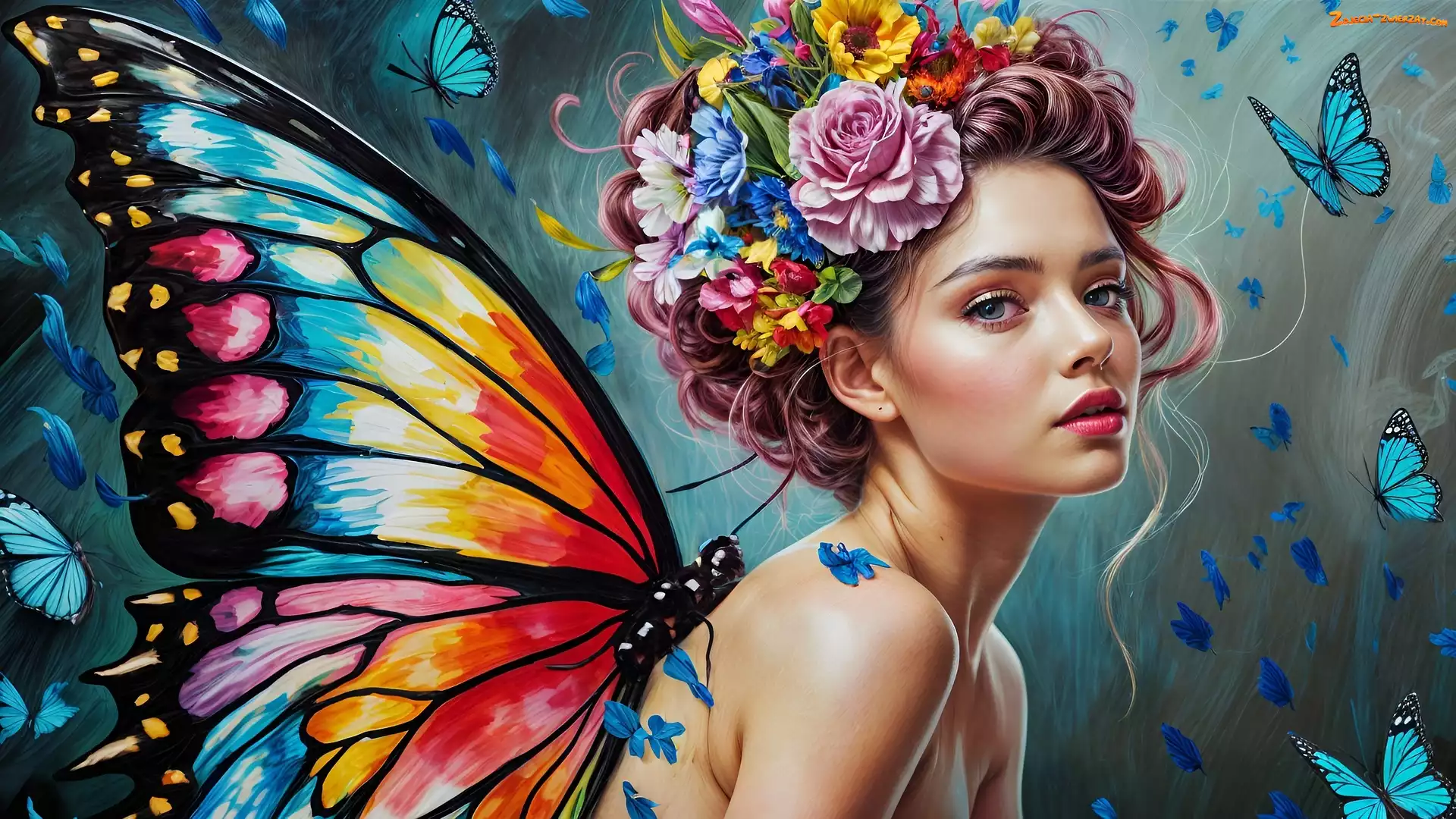Zdjęcie: Skrzydła, Kwiaty, Grafika, Dziewczyna, Motyle