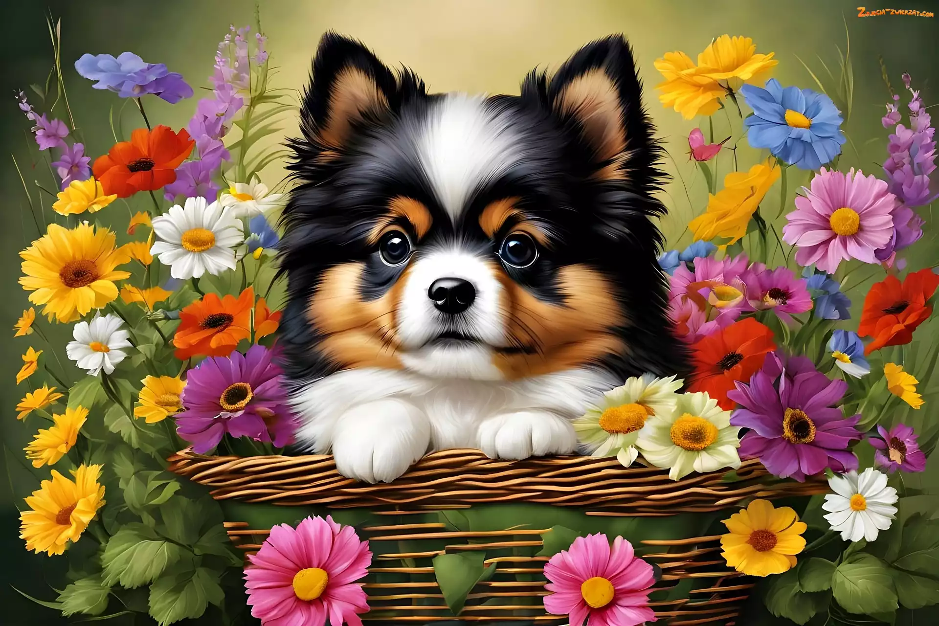 Zdjęcie: Koszyk, Kwiaty, Grafika, Pies, Szczeniak