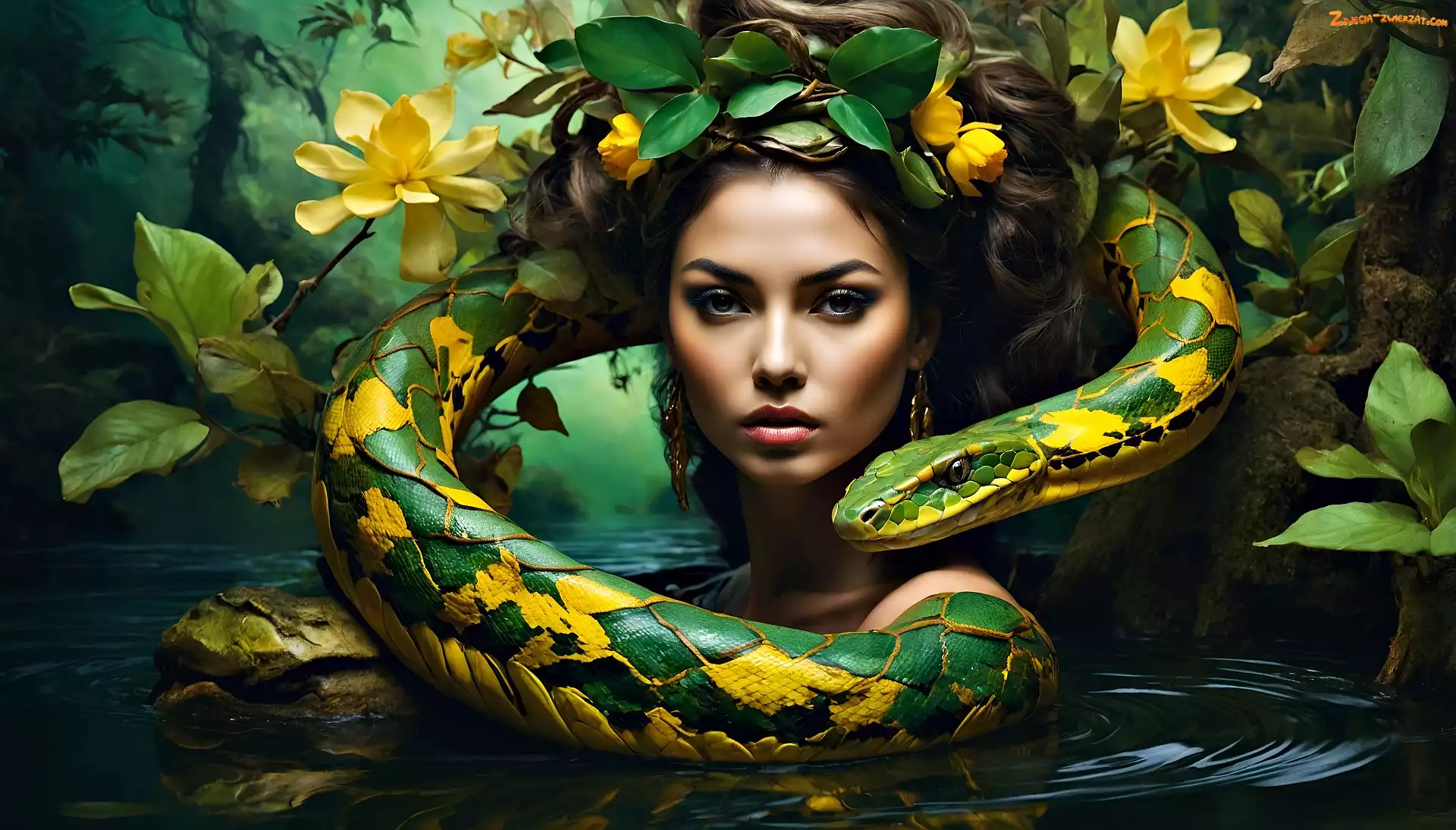 Zdjęcie: Kobieta, Wąż, Liście, Kwiaty