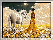 Zdjęcie: Chmury, Kobieta, Koń, Kwiaty, Grafika, Łąka, Księżyc
