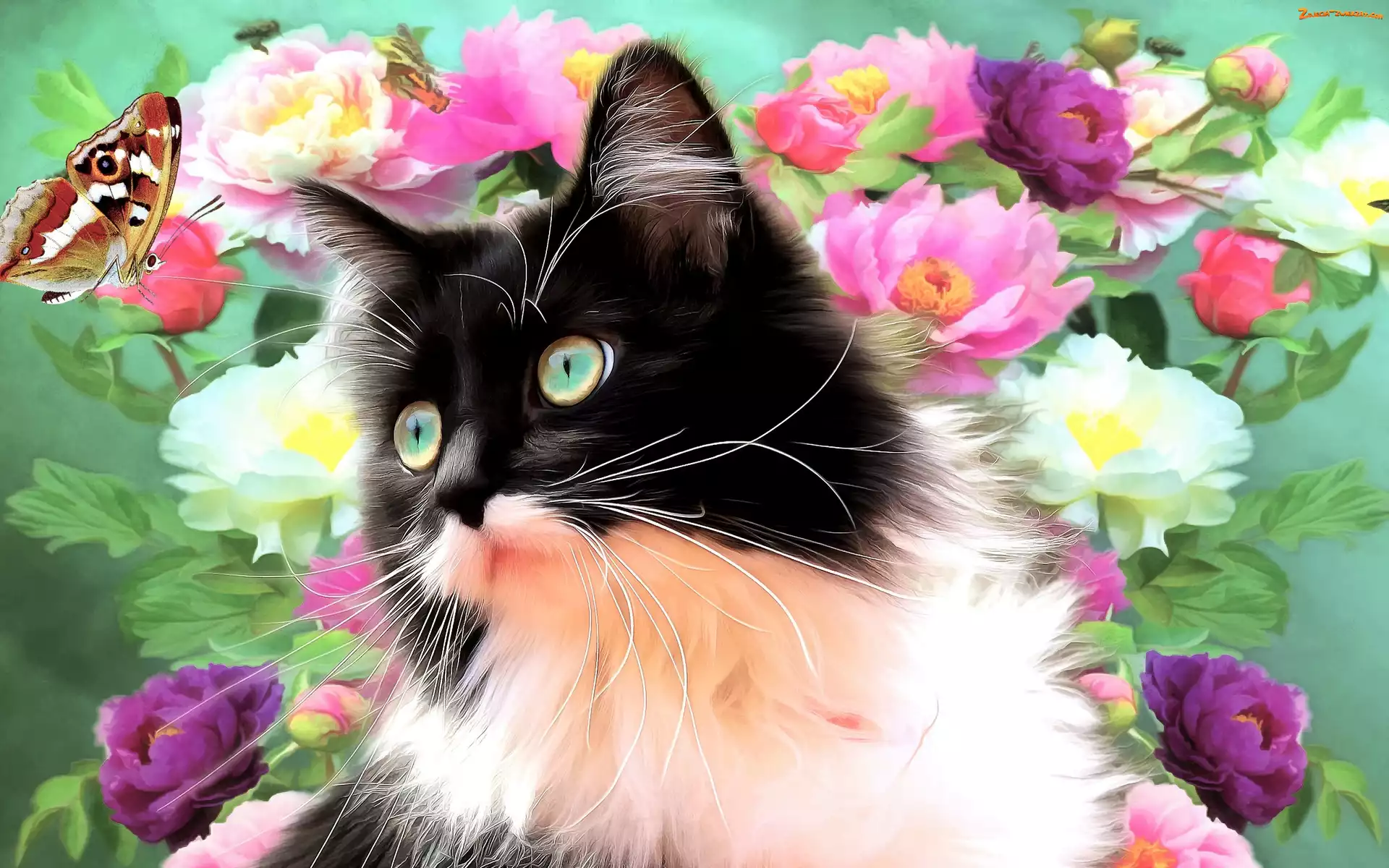 Zdjęcie: Kwiaty, Grafika, Kot, Motylki