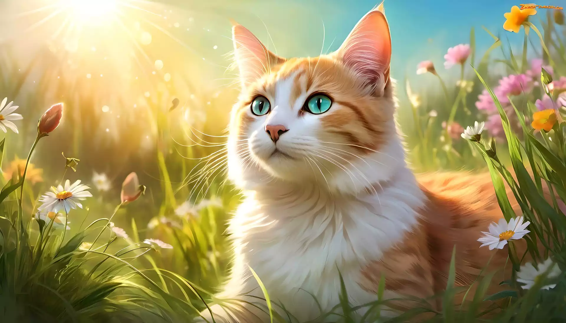 Zdjęcie: Kot, Trawa, Grafika, Kwiaty