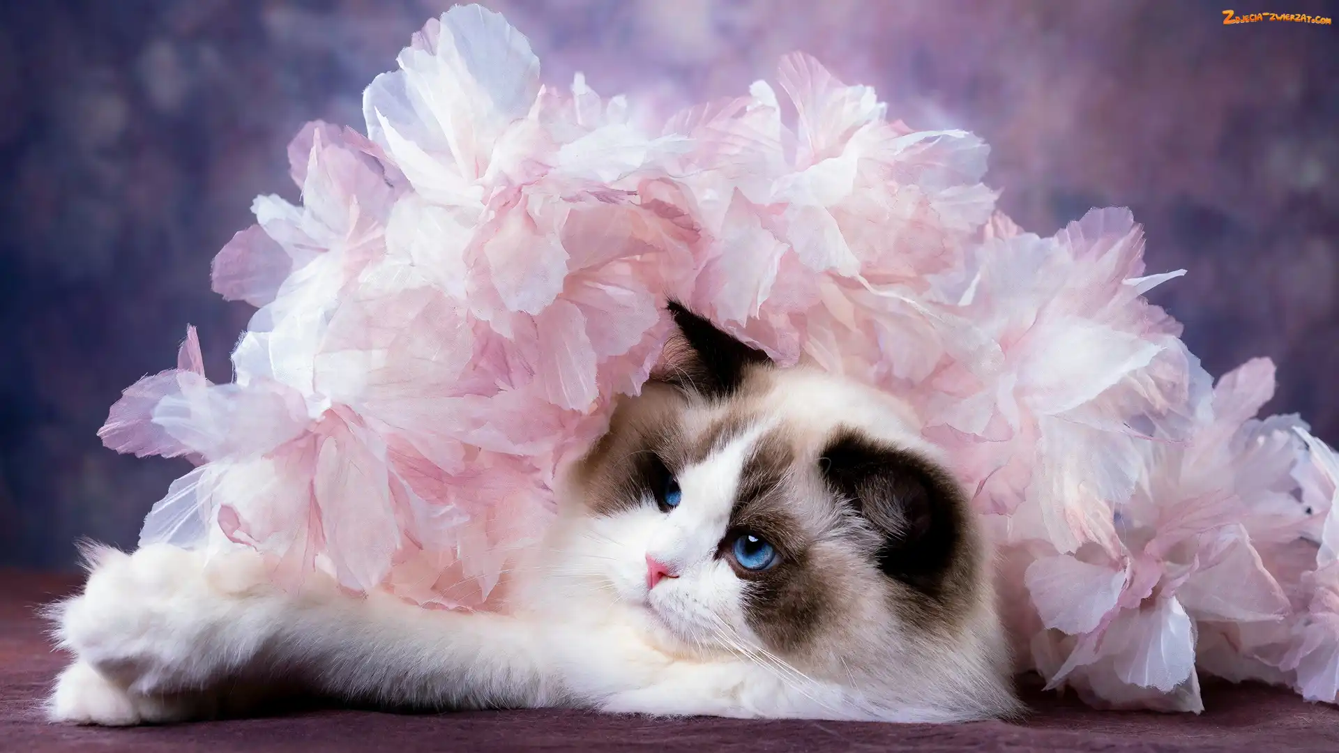 Zdjęcie: Kwiaty, Różowe, Ragdoll, Kot, Sztuczne