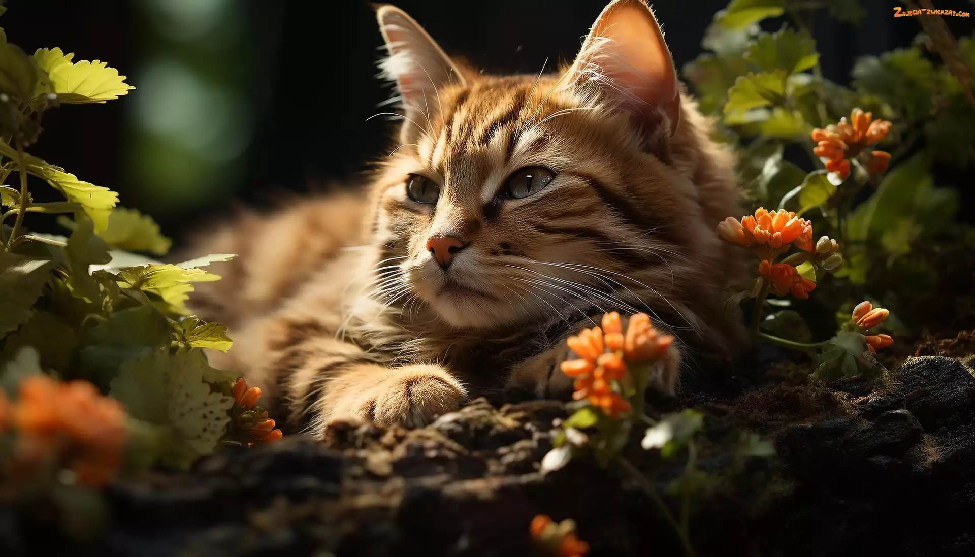 Zdjęcie: Kot, Spojrzenie, Rośliny, Kwiaty