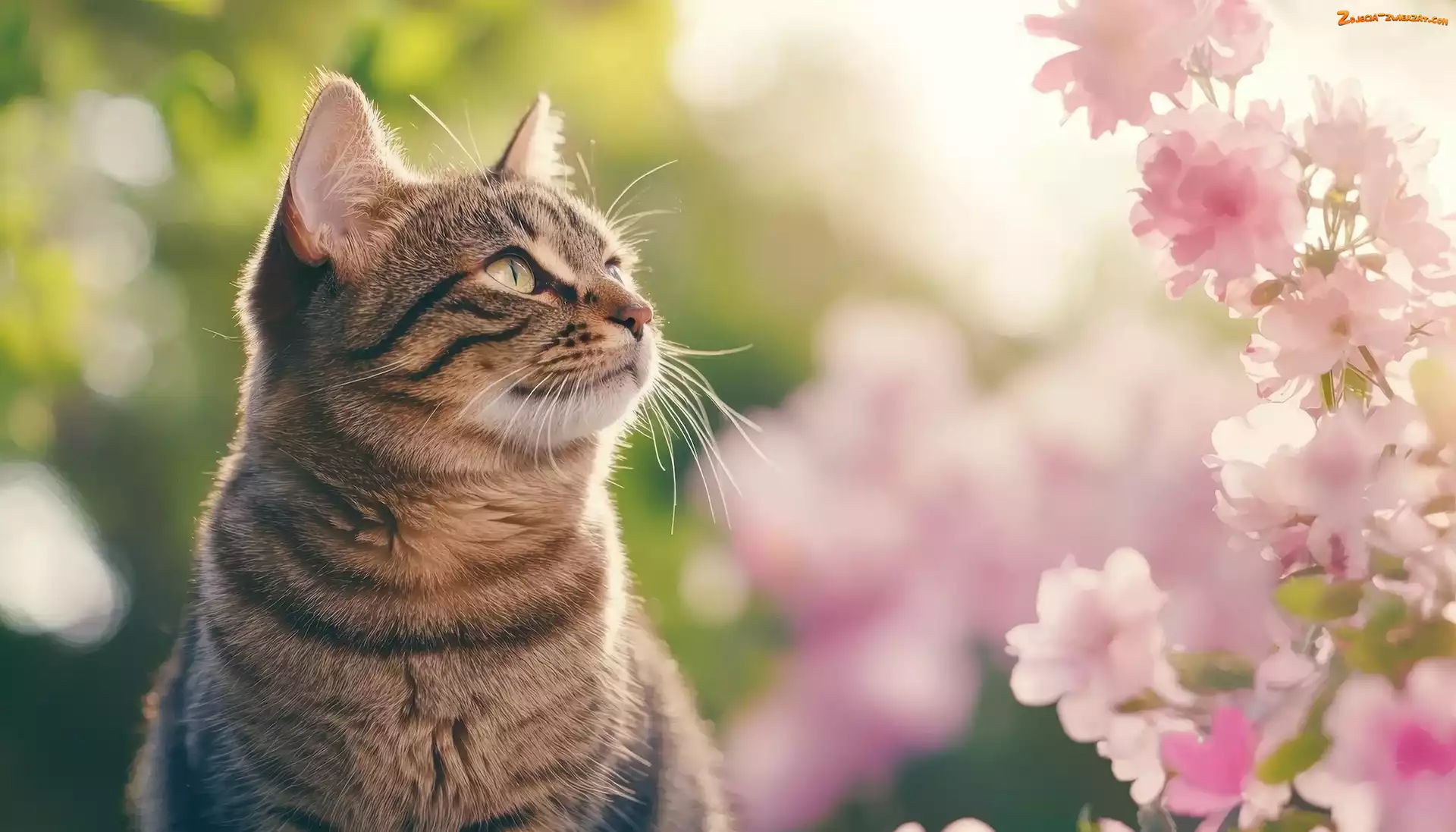 Zdjęcie: Kot, Spojrzenie, Różowe, Kwiaty