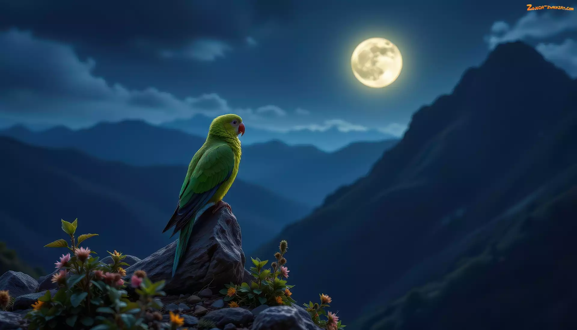 Zdjęcie: Góry, Skała, Papuga, Kwiaty, Noc, Księżyc