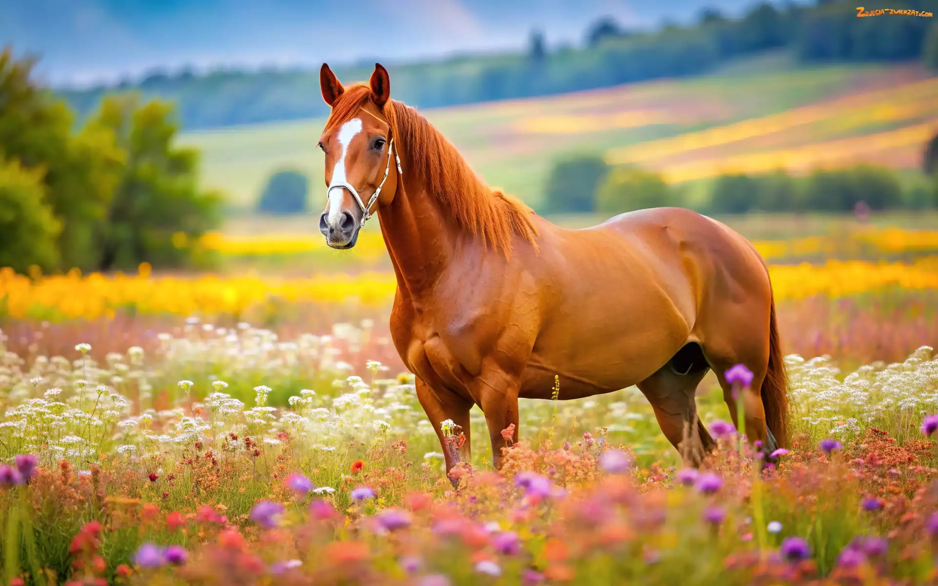 Drzewa, Kwiaty, Lato, Koń, Łąka