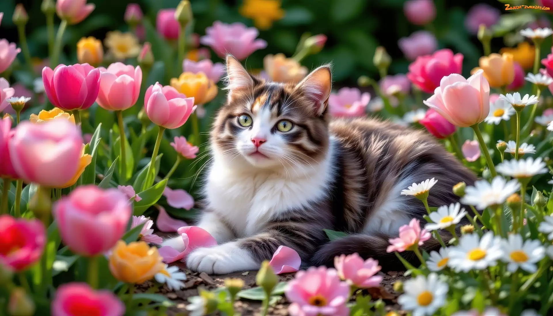 Zdjęcie: Leżący, Kot, Tulipany, Kwiaty