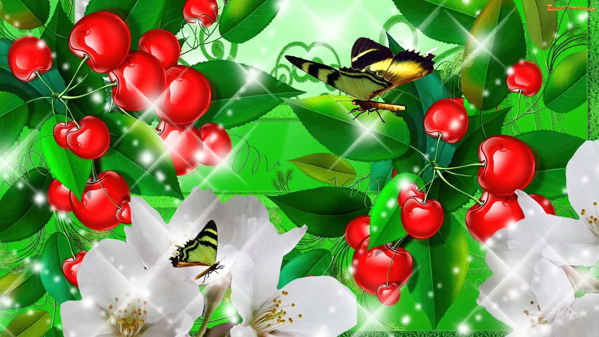 Kwiaty, Grafika, Motyle, Czereśnie
