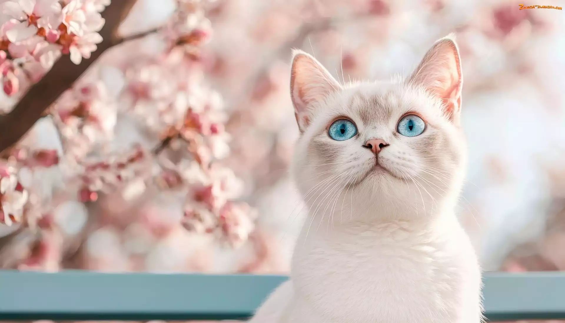 Zdjęcie: Drzewo owocowe, Kot, Kwiaty, Biały, Niebieskooki