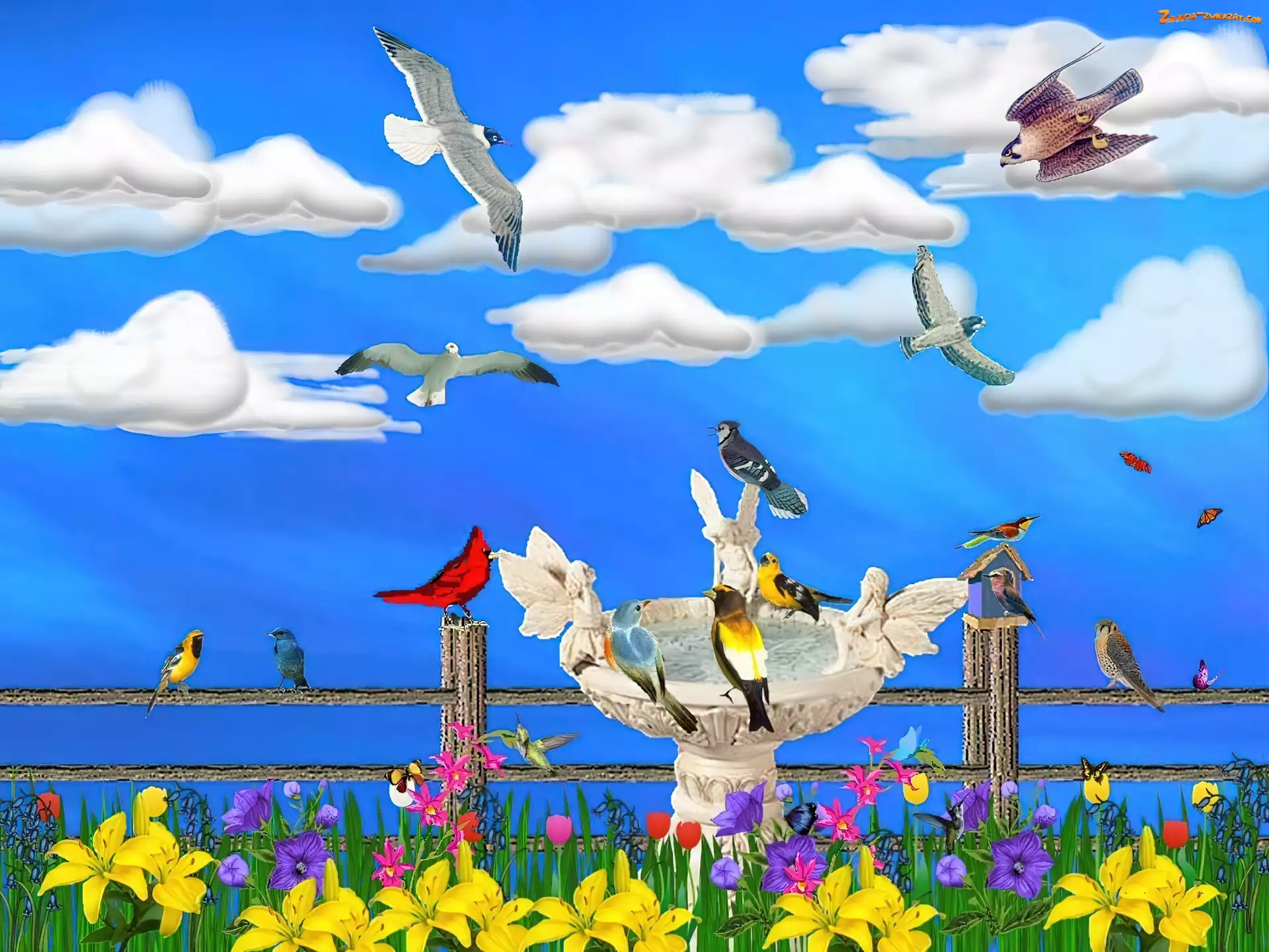 Zdjęcie: Kwiaty, Ptaki, Ogródek, Różne