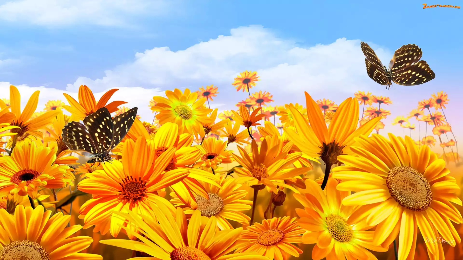 Zdjęcie: Kwiaty, Niebo, Żółte, Motyle