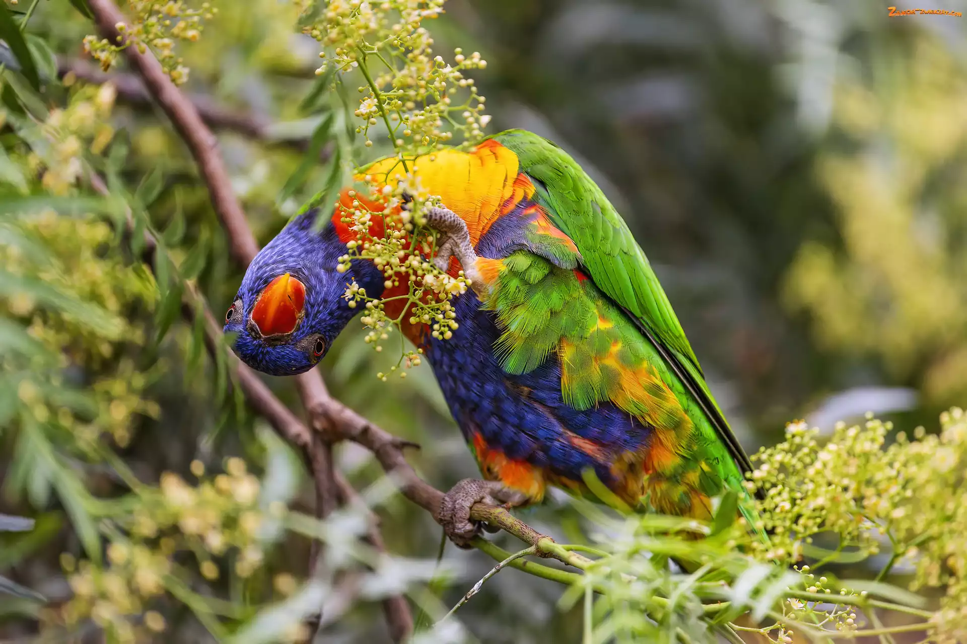 Zdjęcie: Gałązki, Lorysa tęczowa, Kwiaty, Ptak, Papuga