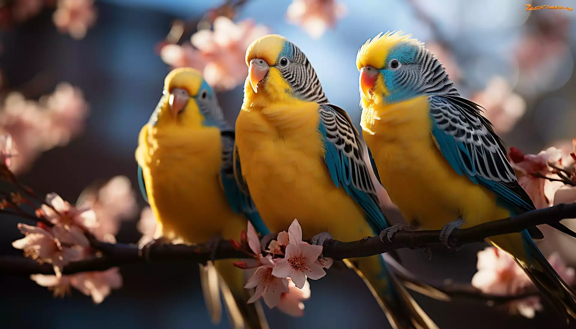 Zdjęcie: Gałąź, Papugi, Papużki faliste, Ptaki, Grafika, Trzy, Kwiaty