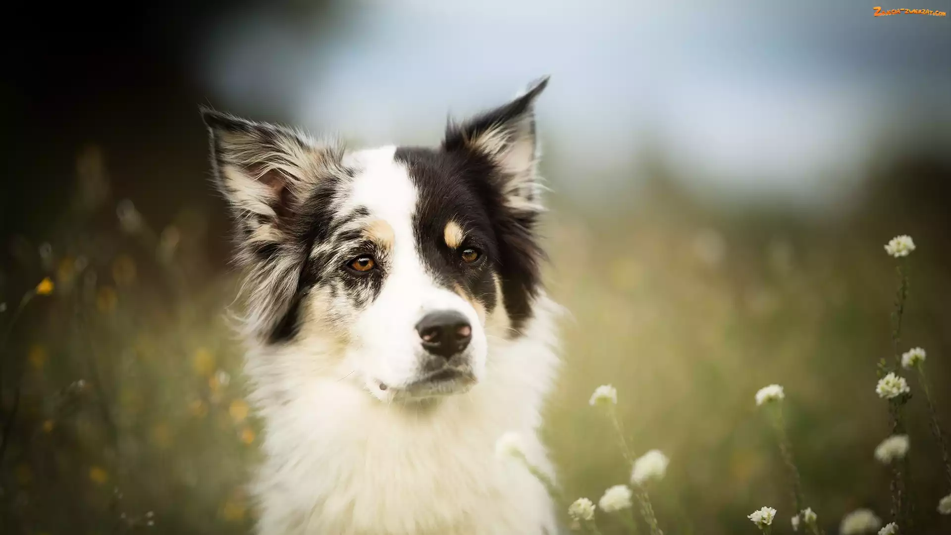Zdjęcie: Kwiaty, Łąka, Border collie, Pies, Mordka