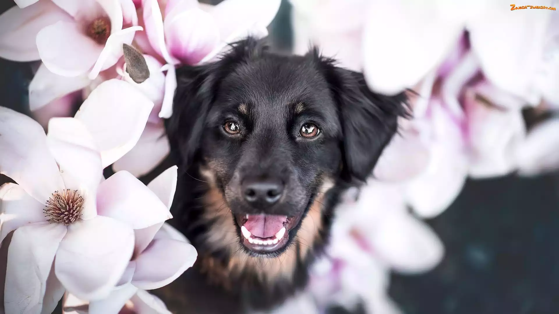 Zdjęcie: Pies, Czarny, Magnolie, Kwiaty
