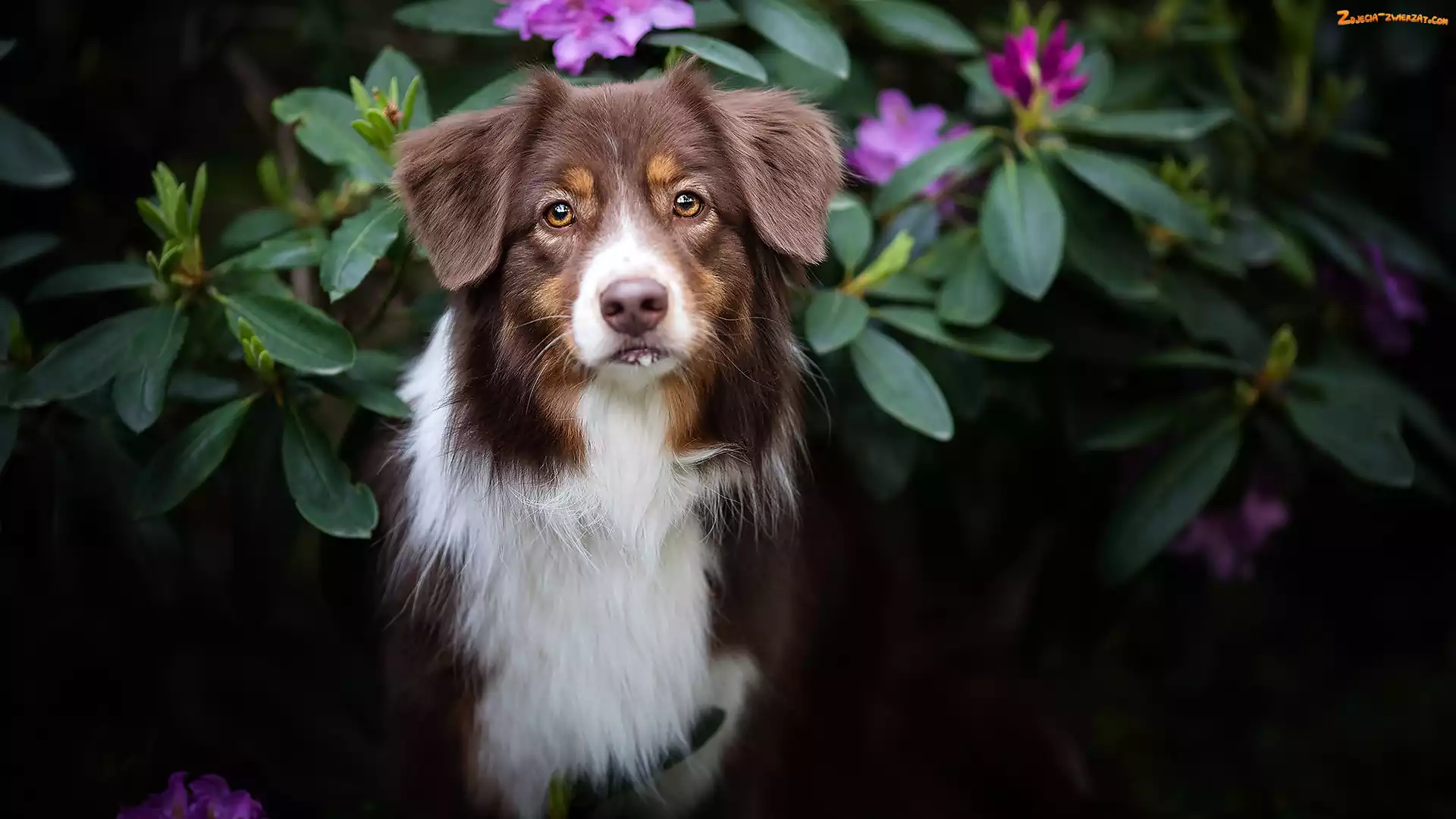 Zdjęcie: Kwiaty, Krzewy, Owczarek australijski, Pies, Mordka