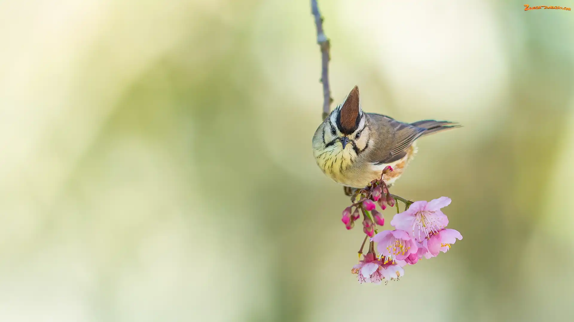 Zdjęcie: Kwiaty, Różowe, Czupurnik białolicy, Ptak, Gałązka