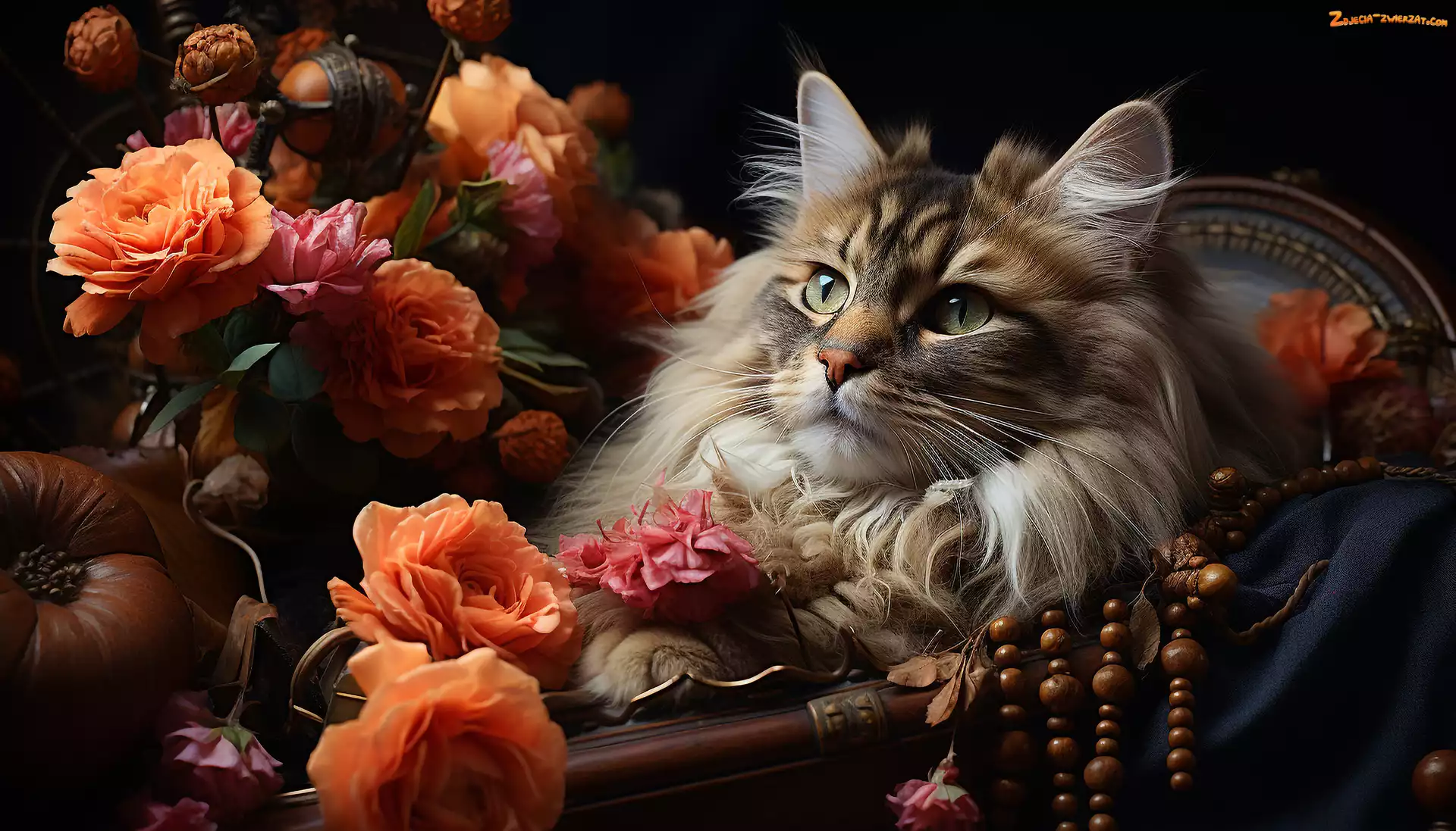 Zdjęcie: Puszysty, Kot, Fotel, Kwiaty