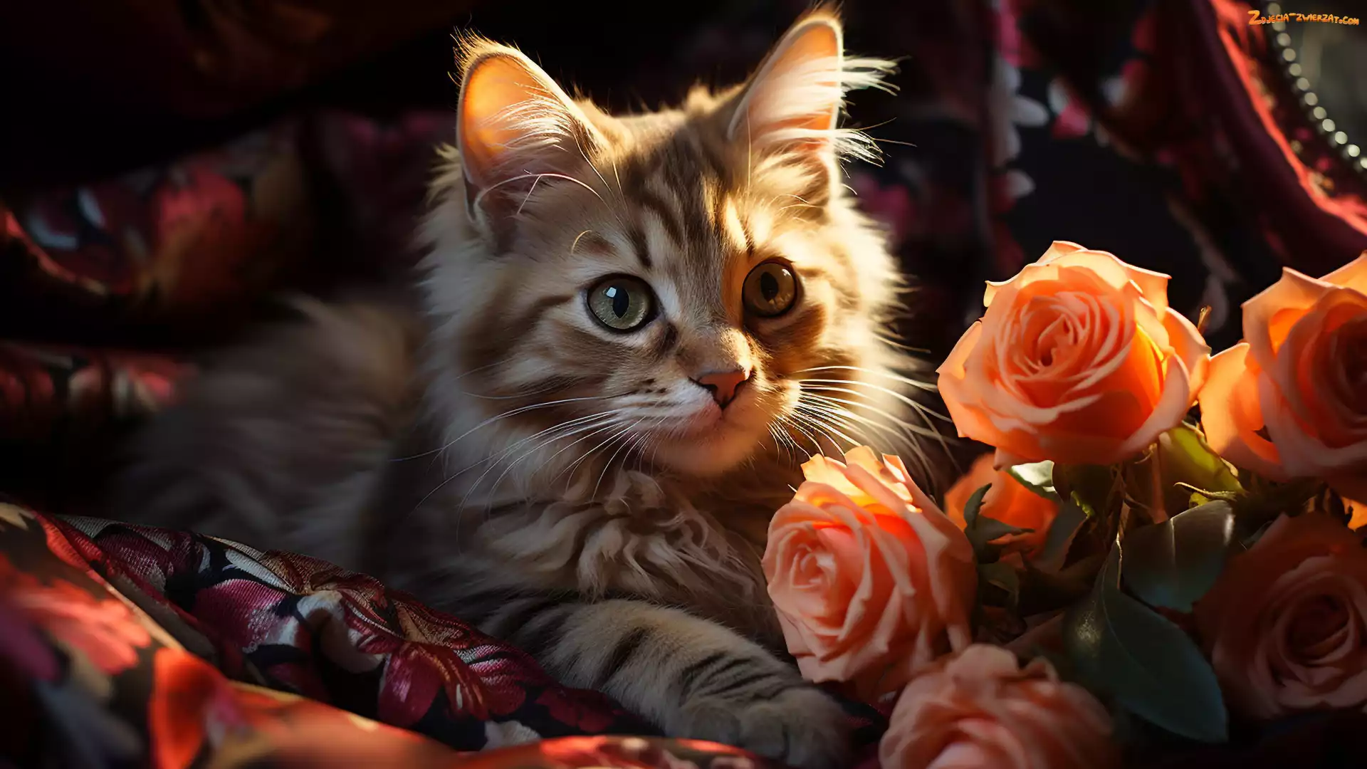 Zdjęcie: Pomarańczowe, Kwiaty, Róże, Puszysty, Kot