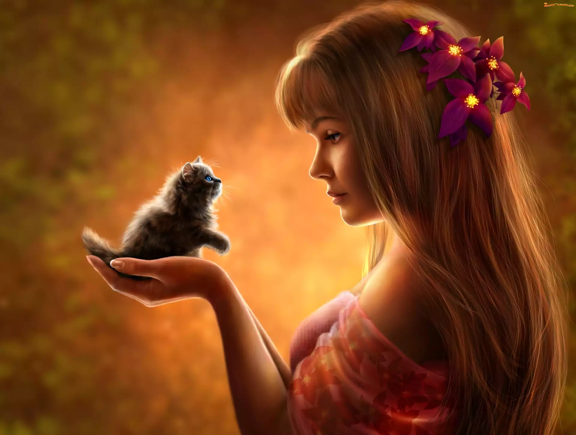 Zdjęcie: Kwiaty, Włosy, Kotek, Słodki, Dziewczyna