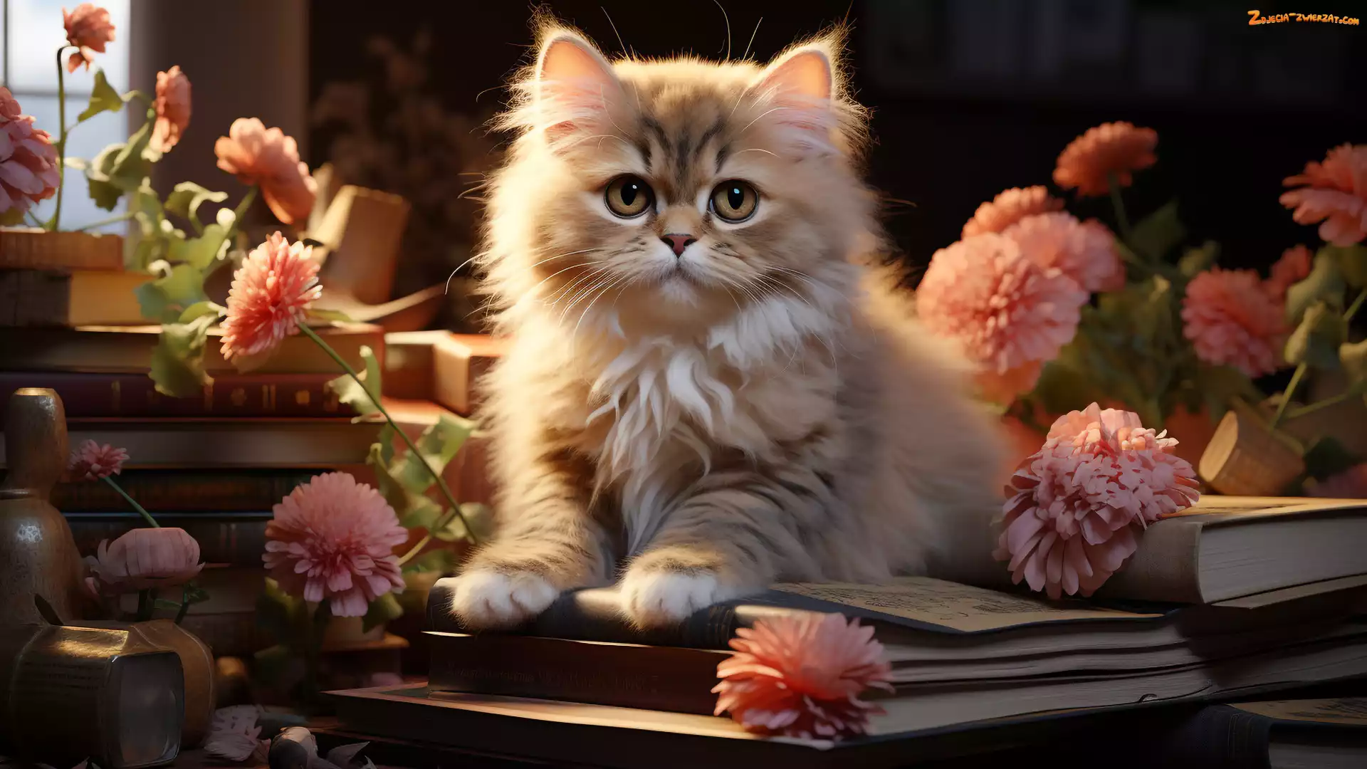 Zdjęcie: Książki, Kwiaty, Stół, Puszysty, Kot