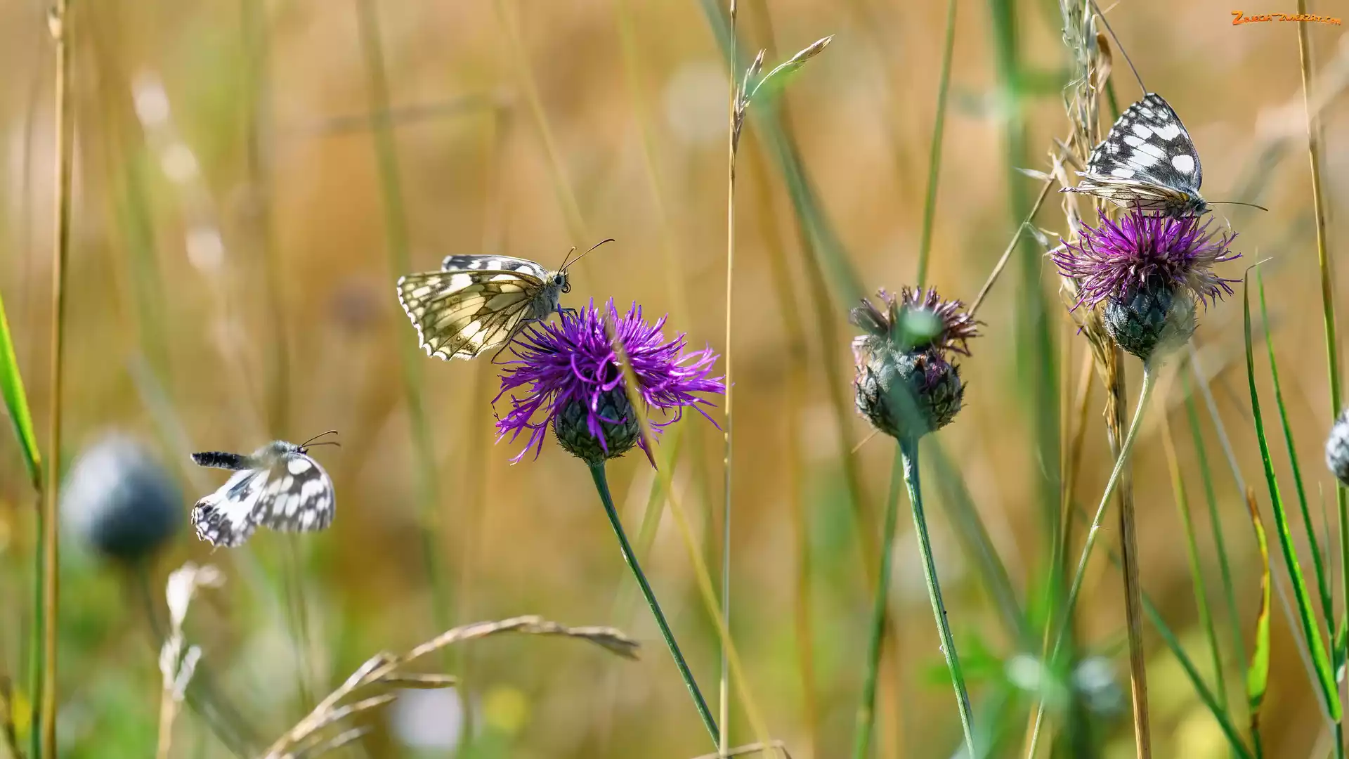 Zdjęcie: Motyle, Kwiaty, Trawa, Chabry łąkowe