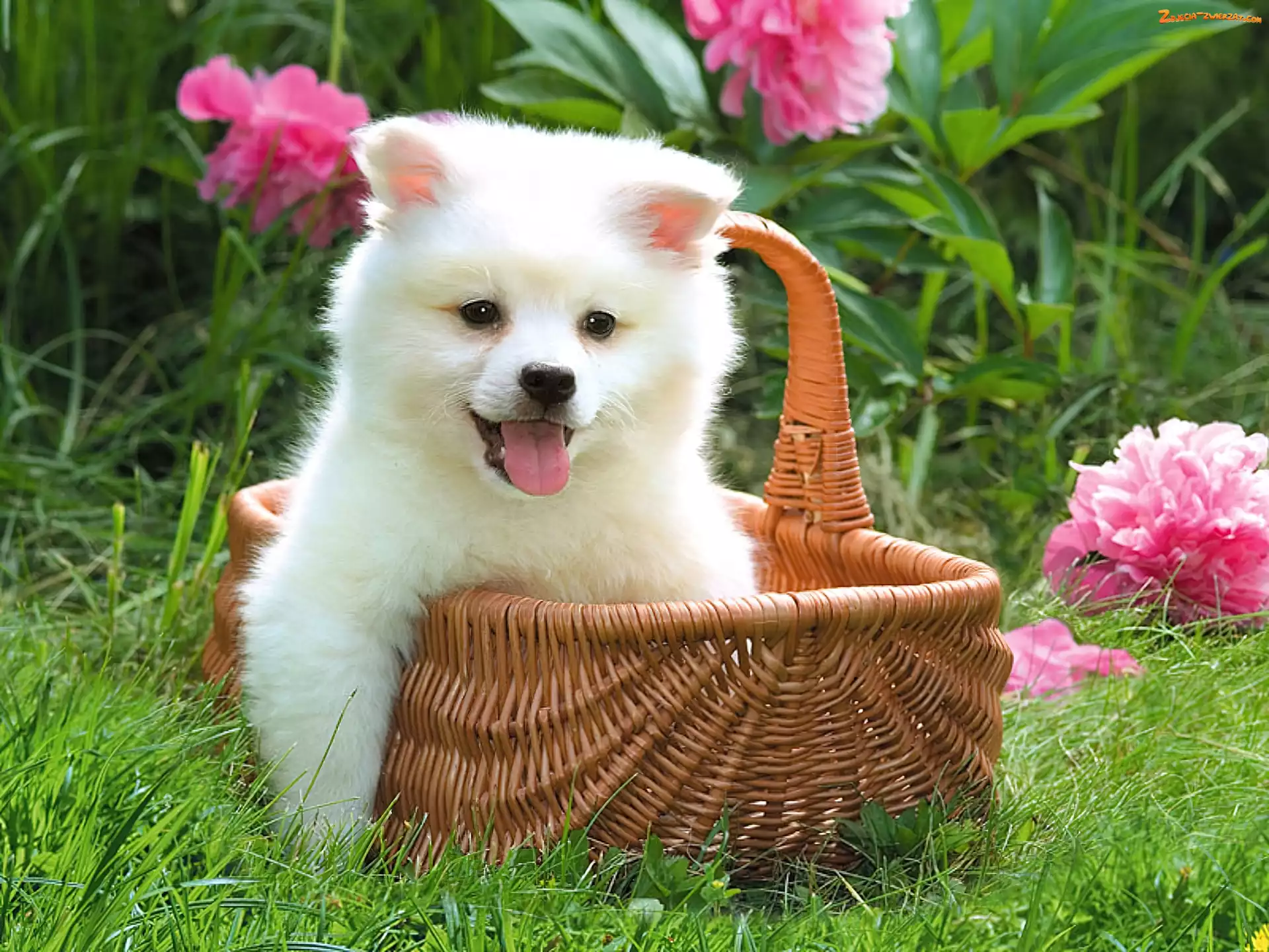 Zdjęcie: Trawa, Kwiaty, Piesek, Koszyk