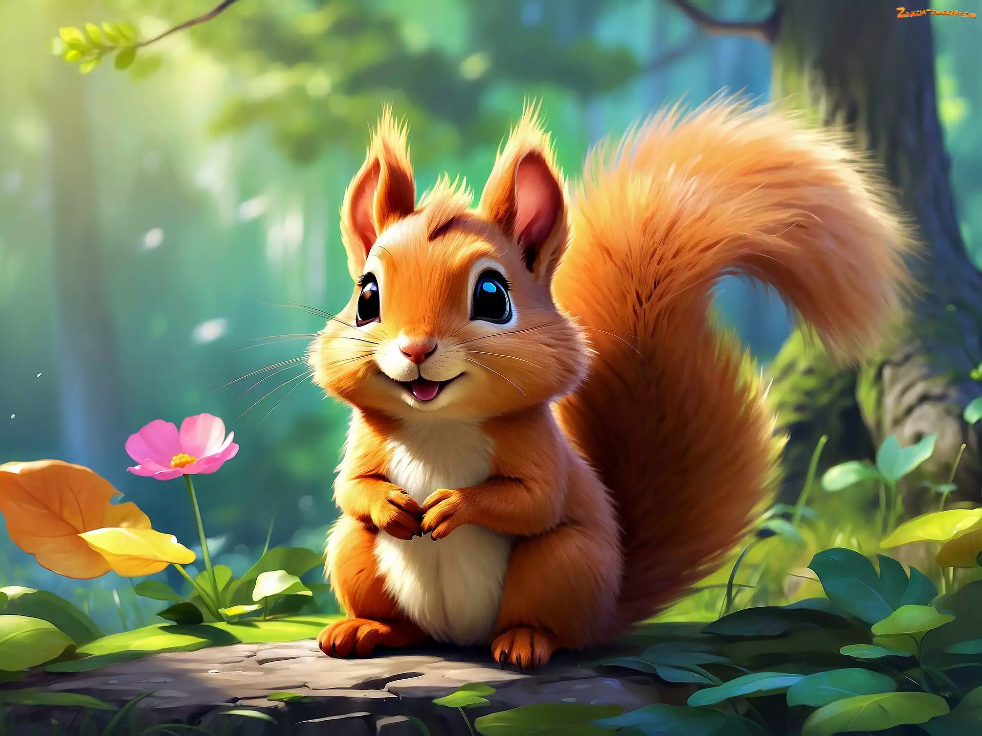 Zdjęcie: Wiewiórka, Drzewa, Grafika, Kwiaty