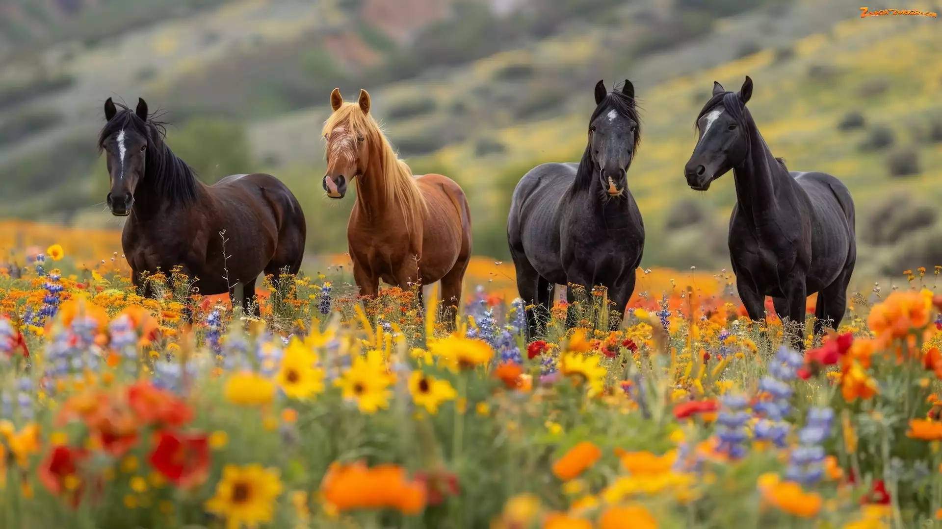 Zdjęcie: Konie, Cztery, Kwiaty, Łąka