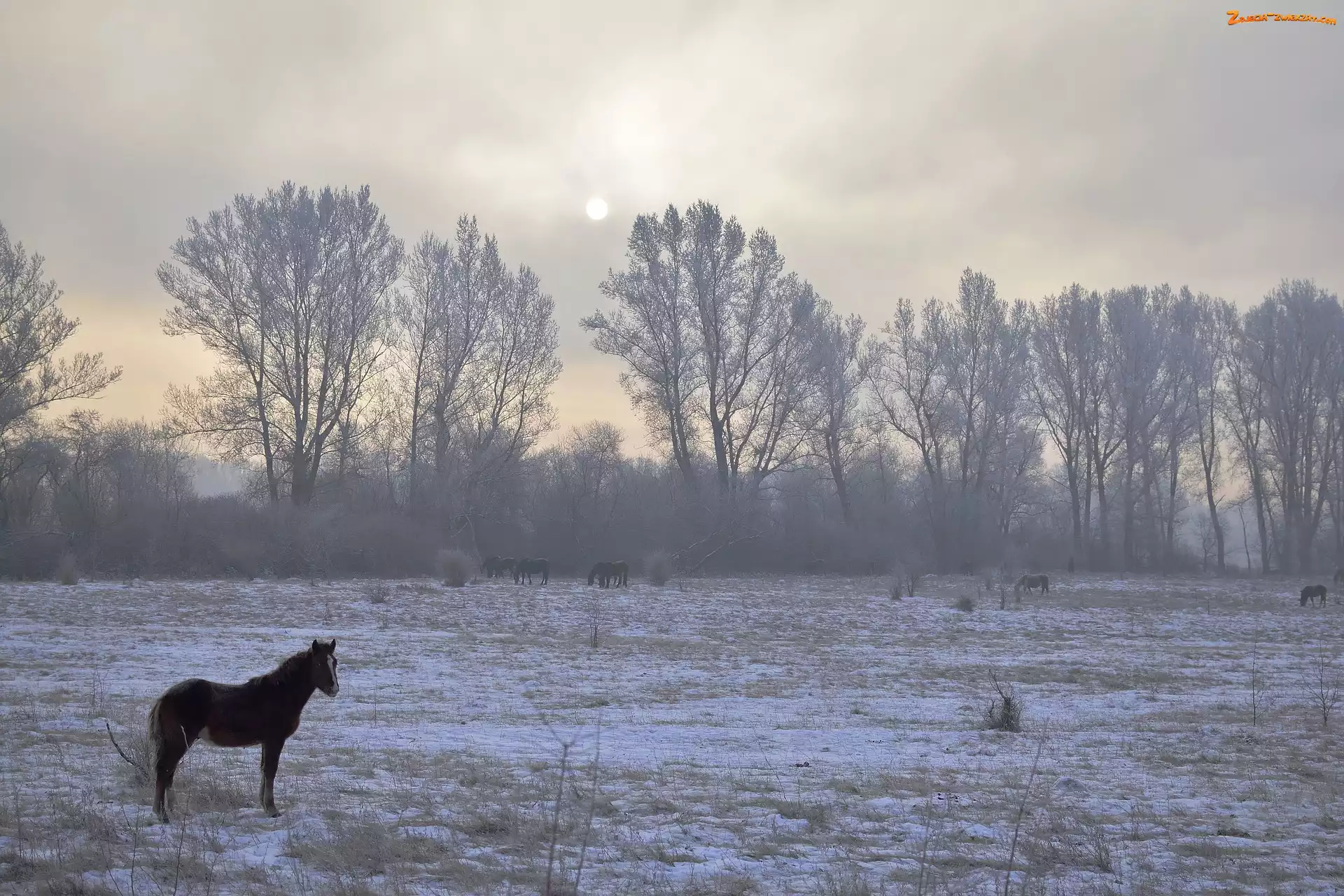 Zdjęcie: Drzewa, Pastwisko, Zima, Łąka, Konie, Mgła