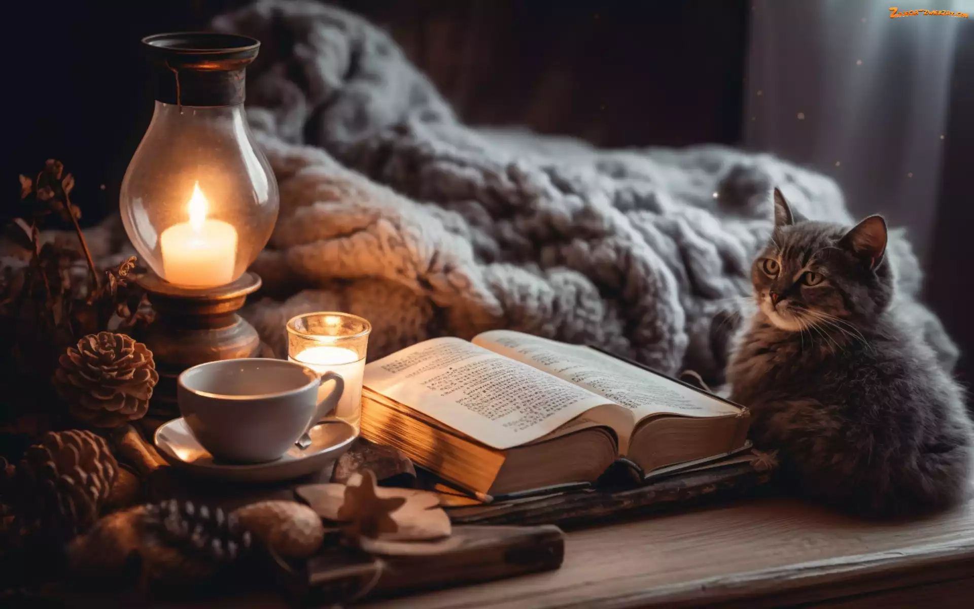 Zdjęcie: Świece, Filiżanka, Książka, Lampa, Koc, Kotek, Szyszki