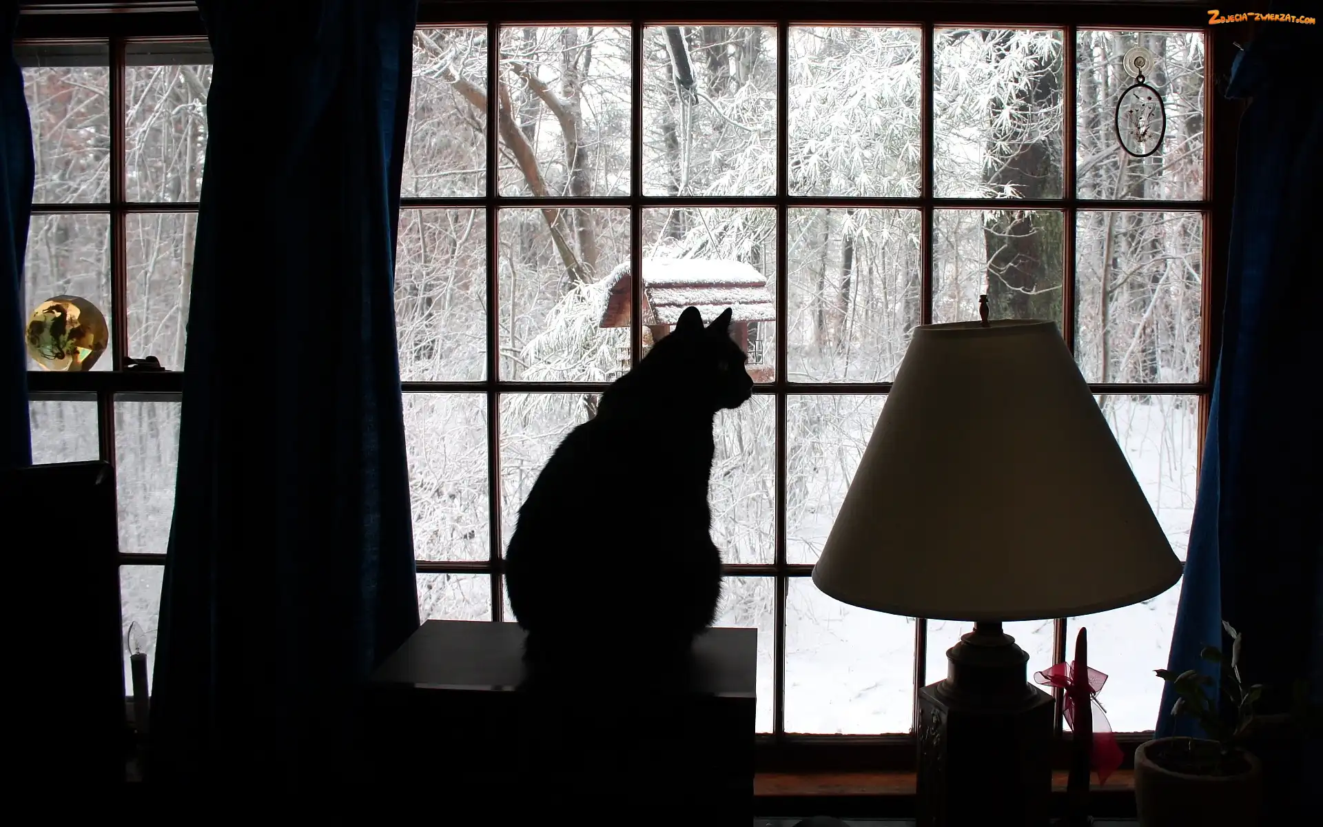 Zdjęcie: Lampa, Kot, Okno, Zima, Czarny