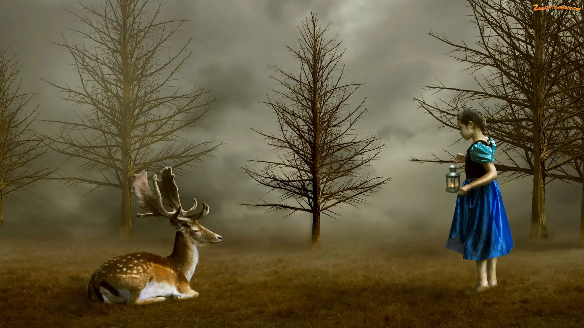 Lampion, Drzewa, Dziewczynka, Jeleń