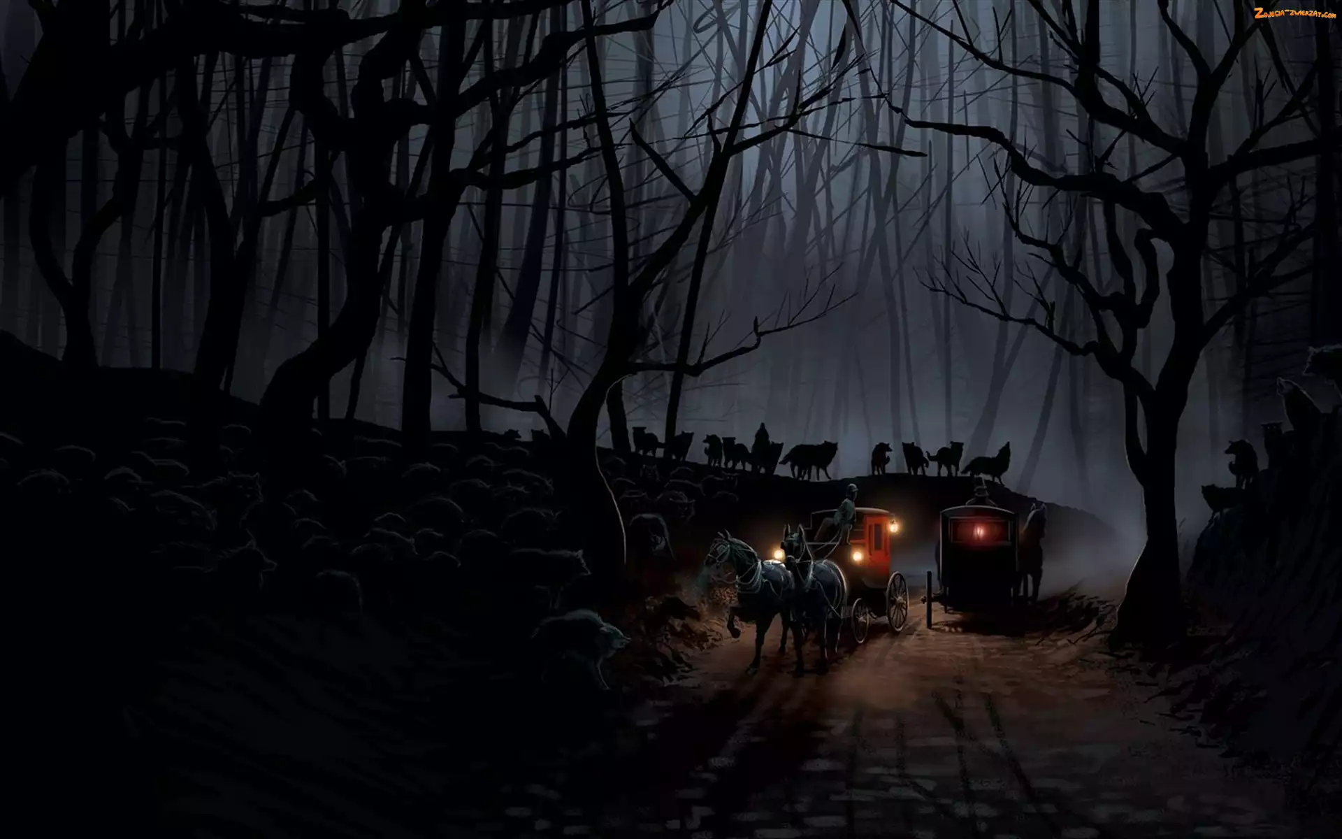 Las, Dyliżanse, Noc, Mgła, Droga, Wilki
