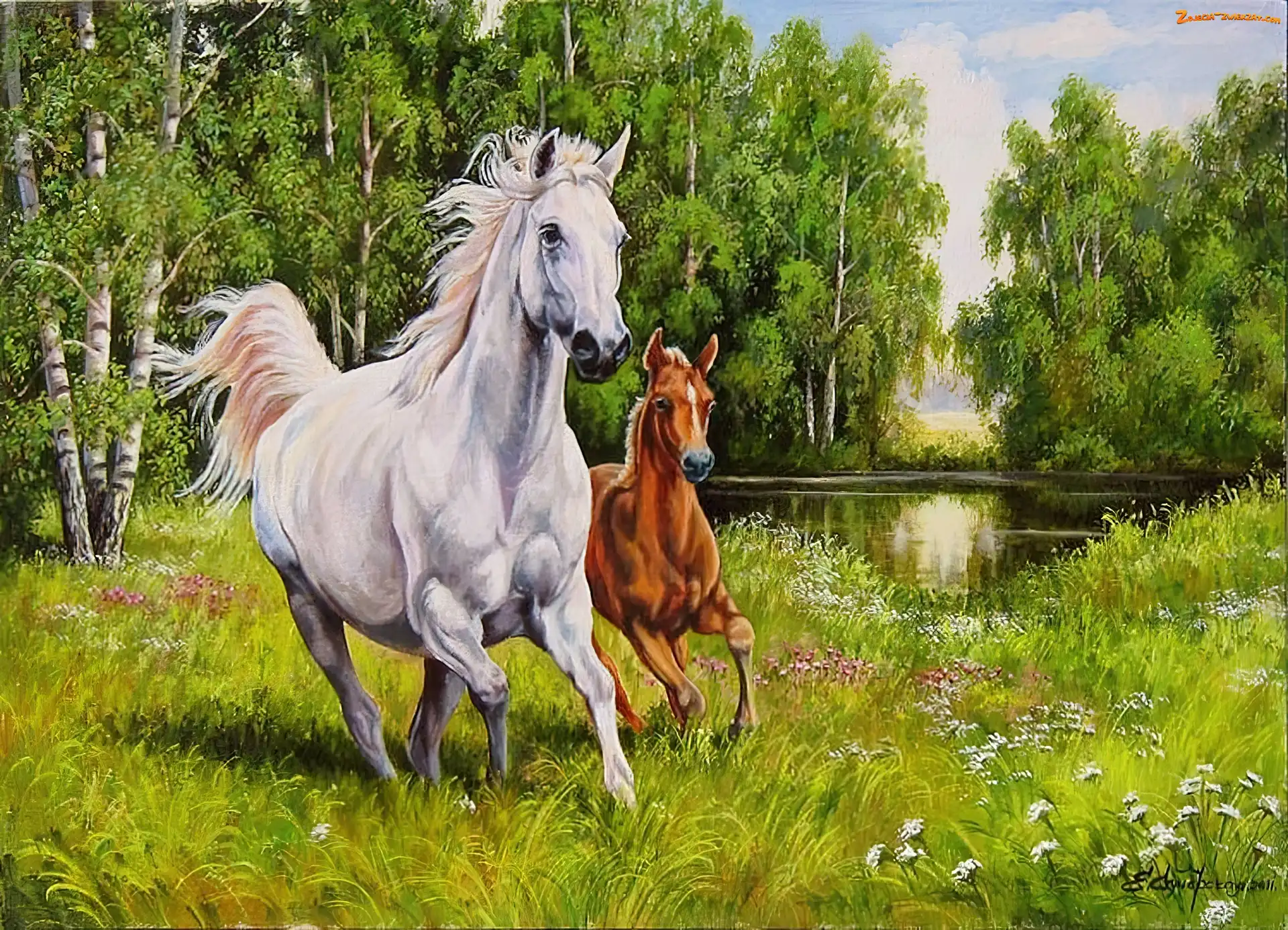 Zdjęcie: Las, Brzozowy, Konie, Dwa, Łąka