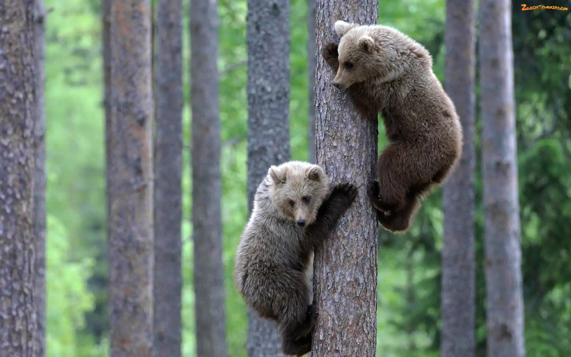 Zdjęcie: Las, Drzewie, Niedźwiadki, Dwa, Na